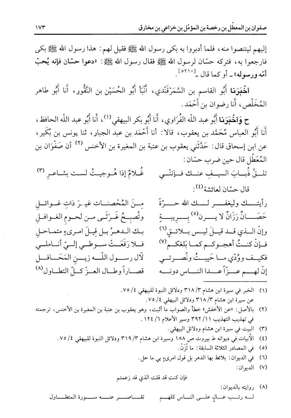 إليهم ليتنصوا منه فلما أدبروا به بكى رسول الله (صلى الله عليه وسلم) فقيل لهم هذا رسول الله (صلى الله عليه وسلم) بكى فارجعوا به فتركه حسان لرسول الله (صلى الله عليه وسلم) فقال رسول الله (صلى الله عليه وسلم) دعوا حسان فإنه يحب أمه ورسوله أو كما قال أخبرنا أبو القاسم بن السمرقندي أنبأ أبو الحسين بن النقور أنا أبو طاهر المخلص أنا رضوان بن أحمد ح وأخبرنا أبو عبد الله الفراوي أنا أبو بكر البيهقي (1) أنا أبو عبد الله الحافظ أنا أبو العباس محمد بن يعقوب قالا أنا أحمد بن عبد الجبار ثنا يونس بن بكير عن ابن إسحاق قال حدثني يعقوب بن عتبة بن المغيرة بن الأخنس (2) أن صفوان بن المعطل قال حين ضرب حسان * تلق ذباب السيف عنك فإنني * غلام إذا هوجيت لست بشاعر (3) * قال حسان لعائشة (4) : * رأيتك وليغفر لك الله حرة * من المحصنات غير ذات غوائل حصان رزان لا يرن (5) بريبة * وتصبح غرثى من لحوم الغوافل وإن الذي قد قيل ليس بلائق (6) * بك الدهر بل قيل امرئ متماحل فإن كنت أهجوكم كما بلغكم (7) * فلا رفعت سوطي إلي أناملي فكيف وودي ما حييت ونصرتي * لآل رسول الله زين المحافل إن لهم عزا عدا الناس دونه * قصارا وطال العز كل التطاول * (8)