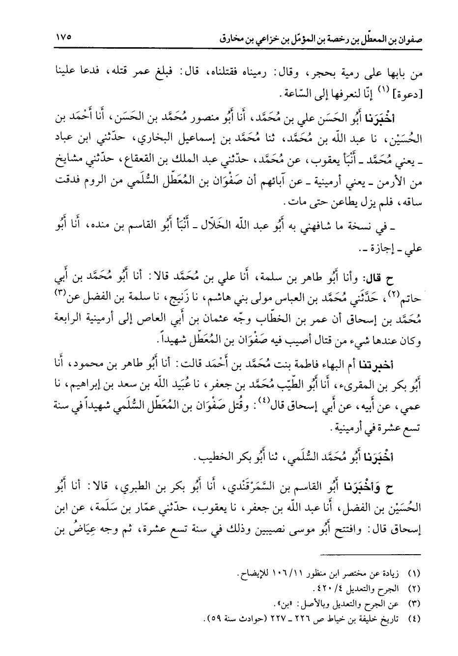 من بابها على رمية بحجر وقال رميناه فقتلناه قال فبلغ عمر قتله فدعا علينا دعوة (1) إنا لنعرفها إلى الساعة أخبرنا أبو الحسن علي بن محمد أنا أبو منصور محمد بن الحسن أنا أحمد بن الحسين نا عبد الله بن محمد ثنا محمد بن إسماعيل البخاري حدثني ابن عباد يعني محمد أنبأ يعقوب عن محمد حدثني عبد الملك بن القعقاع حدثني مشايخ من الأرمن يعني أرمينية عن آبائهم أن صفوان بن المعطل السلمي من الروم فدقت ساقه فلم يزل يطاعن حتى مات في نسخة ما شافهني به أبو عبد الله الخلال أنبأ أبو القاسم بن منده أنا أبو علي إجازة ح قال وأنا أبو طاهر بن سلمة أنا علي بن محمد قالا أنا أبو محمد بن أبي حاتم (2) حدثني محمد بن العباس مولى بني هاشم نا زنيج نا سلمة بن الفضل عن (3) محمد بن إسحاق أن عمر بن الخطاب وجه عثمان بن أبي العاص إلى أرمينية الرابعة وكان عندها شئ من قتال أصيب فيه صفوان بن المعطل شهيدا أخبرتنا أم البهاء فاطمة بنت محمد بن أحمد قالت أنا أبو طاهر بن محمود أنا أبو بكر بن المقرئ أنا أبو الطيب محمد بن جعفر نا عبيد الله بن سعد بن إبراهيم نا عمي عن أبيه عن أبي إسحاق قال (4) : وقتل صفوان بن المعطل السلمي شهيدا في سنة تسع عشرة في أرمينية أخبرنا أبو محمد السلمي ثنا أبو بكر الخطيب ح وأخبرنا أبو القاسم بن السمرقندي أنا أبو بكر بن الطبري قالا أنا أبو الحسين بن الفضل أنا عبد الله بن جعفر نا يعقوب حدثني عمار بن سلمة عن ابن إسحاق قال وافتتح أبو موسى نصيبين وذلك في سنة تسع عشرة ثم وجه عياض بن