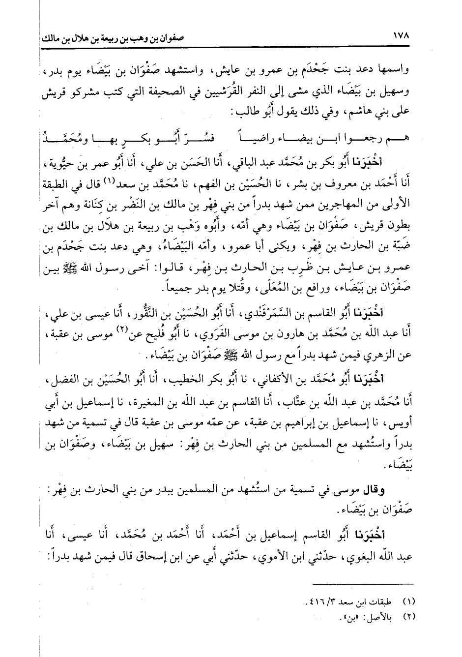 واسمها دعد بنت جحدم بن عمرو بن عايش واستشهد صفوان بن بيضاء يوم بدر وسهيل بن بيضاء الذي مشى إلى النفر القرشيين في الصحيفة التي كتب مشركو قريش على بني هاشم وفي ذلك يقول أبو طالب * هم رجعوا ابن بيضاء راضيا * فسر أبو بكر بها ومحمد * أخبرنا أبو بكر بن محمد عبد الباقي أنا الحسن بن علي أنا أبو عمر بن حيوية أنا أحمد بن معروف بن بشر نا الحسين بن الفهم نا محمد بن سعد (1) قال في الطبقة الأولى من المهاجرين ممن شهد بدرا من بني فهر بن مالك بن النضر بن كنانة وهم آخر بطون قريش صفوان بن بيضاء وهي أمه وأبوه وهب بن ربيعة بن هلال بن مالك بن ضبة بن الحارث بن فهر ويكنى أبا عمرو وأمه البيضاء وهي دعد بنت جحدم بن عمرو بن عايش بن ظرب بن الحارث بن فهر قالوا آخى رسول الله (صلى الله عليه وسلم) بين صفوان بن بيضاء ورافع بن المعلى وقتلا يوم بدر جميعا أخبرنا أبو القاسم بن السمرقندي أنا أبو الحسين بن النقور أنا عيسى بن علي أنا عبد الله بن محمد بن هارون بن موسى الفروي نا أبو فليح عن (2) موسى بن عقبة عن الزهري فيمن شهد بدرا مع رسول الله (صلى الله عليه وسلم) صفوان بن بيضاء أخبرنا أبو محمد بن الأكفاني نا أبو بكر الخطيب أنا أبو الحسين بن الفضل أنا محمد بن عبد الله بن عتاب أنا القاسم بن عبد الله بن المغيرة نا إسماعيل بن أبي أويس نا إسماعيل بن إبراهيم بن عقبة عن عمه موسى بن عقبة قال في تسمية من شهد بدرا واستشهد مع المسلمين من بني الحارث بن فهر سهيل بن بيضاء وصفوان بن بيضاء وقال موسى في تسمية من استشهد من المسلمين ببدر من بني الحارث بن فهر صفوان بن بيضاء أخبرنا أبو الفاسم إسماعيل بن أحمد أنا أحمد بن محمد أنا عيسى أنا عبد الله البغوي حدثني ابن الأموي حدثني أبي عن ابن إسحاق قال فيمن شهد بدرا