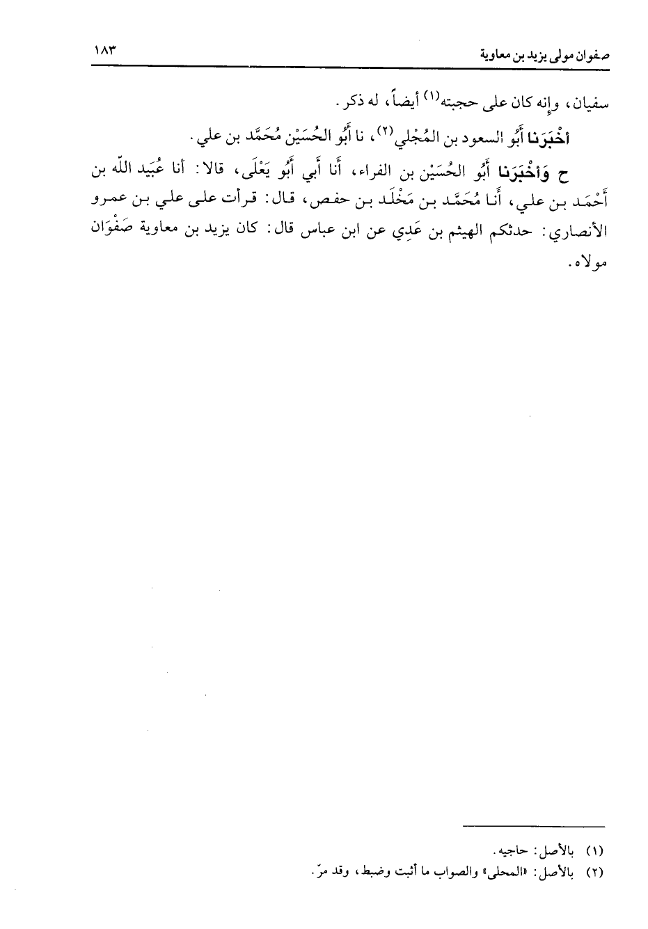 سفيان وإنه كان على حجبته (1) أيضا له ذكر أخبرنا أبو السعود بن المجلي (2) نا أبو الحسين محمد بن علي ح وأخبرنا أبو الحسين بن الفراء أنا أبي أبو يعلى قالا أنا عبيد الله بن أحمد بن علي أنا محمد بن مخلد بن حفص قال قرأت على علي بن عمرو الأنصاري حدثكم الهيثم بن عدي عن ابن عباس قال كان يزيد بن معاوية بن صفوان مولاه