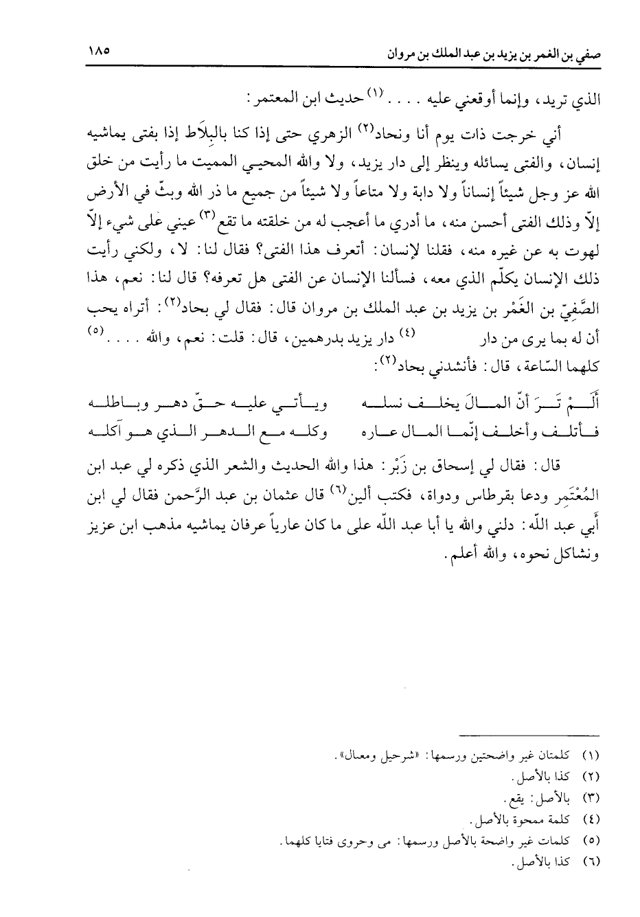 الذي تريد وإنما أوقعني عليه (1) حديث ابن المعتمر أني خرجت ذات يوم أنا ونحاد (2) الزهري حتى إذا كنا بالبلاط إذا بفتى يماشيه إنسان والفتى يسائله وينظر إلى دار يزيد ولا والله المحيي المميت ما رأيت من خلق الله عز وجل شيئا إنسانا ولا دابة ولا متاعا ولا شيئا من جميع ما ذر الله وبث في الأرض إلا وذلك الفتى أحسن منه ما أدري ما أعجب له من خلقته ما تقع (3) عيني على شئ إلا لهوت به عن غيره منه فقلنا لإنسان أتعرف هذا الفتى فقال لنا لا ولكني رأيت ذلك الإنسان يكلم الذي معه فسألنا الإنسان عن الفتى هل تعرفه قال لنا نعم هذا الصفي بن الغمر بن يزيد بن عبد الملك بن مروان قال فقال لي بحاد (2) أتراه يحب أن له بما يرى من دار (4) دار يزيد بدرهمين قال قلت نعم والله (5) كلهما الساعة قال فأنشدني بحاد (2) : * ألم تر أن المال يخلف نسله * ويأتى عليه حق دهر وباطله فأتلف وأخلف إنما المال عاره * وكله مع الدهر الذي هو آكله * قال فقال لي إسحاق بن زبر هذا والله الحديث والشعر الذي ذكره لي عبد ابن المعتمر ودعا بقرطاس ودواة فكتب ألين (6) قال عثمان بن عبد الرحمن فقال لي ابن أبي عبد الله دلني والله يا أبا عبد الله على ما كان عاريا عرفان يماشيه مذهب ابن عزيز ونشاكل نحوه والله أعلم