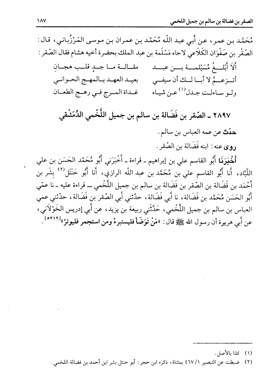 (2) ضبطت عن التبصير 1 / 467 بمثناة ذكره ابن حجر: أبو حنتل بشر ابن أحمد بن فضالة اللخمي