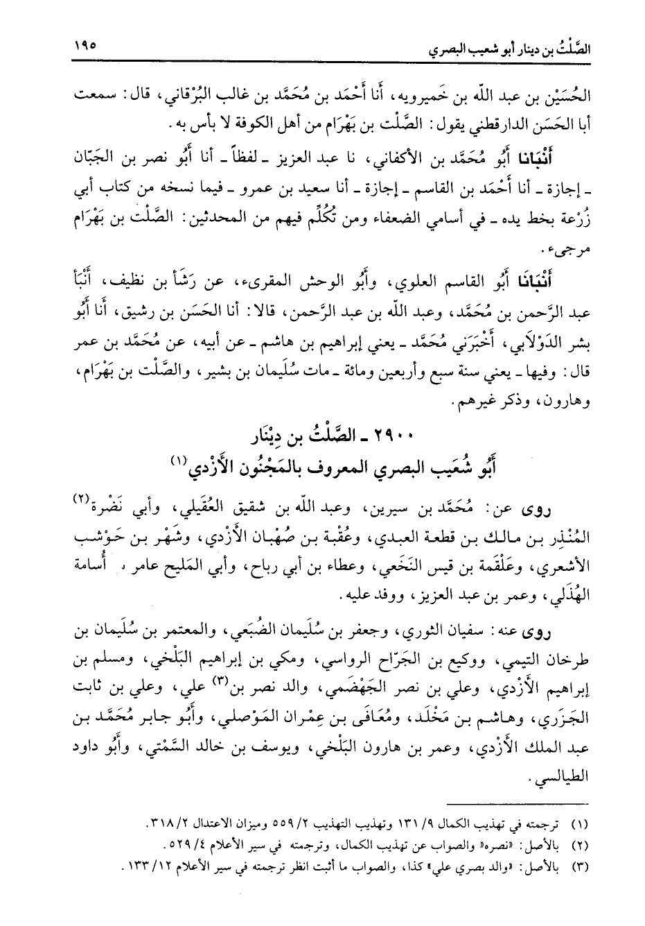2900 - الصلت بن دينار أبو شعيب البصري المعروف بالمجنون الأزدي (1) روى عن محمد بن سيرين وعبد الله بن شقيق العقيلي وأبي نضرة (2) المنذر بن مالك بن قطعة العبدي وعقبة بن صهبان الأزدي وشهر بن حوشب الأشعري وعلقمة بن قيس النخعي وعطاء بن أبي رباح وأبي المليح عامر أسامة الهذلي وعمر بن عبد العزيز ووفد عليه روى عنه سفيان الثوري وجعفر بن سليمان الضبعي والمعتمر بن سليمان بن طرخان التيمي ووكيع بن الجراح الرواسي ومكي بن إبراهيم البلخي ومسلم بن إبراهيم الأزدي وعلي بن نصر الجهضمي والد نصر بن (3) علي وعلي بن ثابت الجزري وهاشم بن مخلد ومعافى بن عمران الموصلي وأبو جابر محمد بن عبد الملك الأزدي وعمر بن هارون البلخي ويوسف بن خالد السمتي وأبو داود الطيالسي