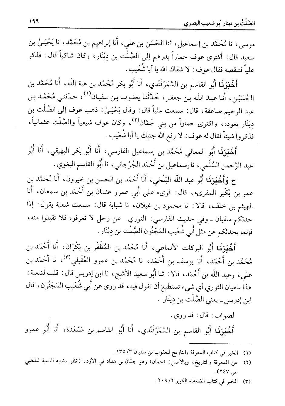 موسى نا محمد بن إسماعيل ثنا الحسن بن علي أنا إبراهيم بن محمد نا يحيى بن سعيد قال أكترى عوف حمارا بدرهم إلى الصلت بن دينار وكان شاكيا قال فذكر عليا فتنقصه فقال عوف لا رفع الله جنبك يا أبا شعيب أخبرنا أبو القاسم بن السمرقندي أنا أبو بكر محمد بن هبة الله أنا محمد بن الحسين أنا عبد الله بن جعفر حدثنا يعقوب بن سفيان (1) حدثني محمد بن عبد الرحيم صاعقة قال سمعت عليا قال وقال يحيى ذهب عوف إلى الصلت بن دينار يعوده واكترى حمارا من بني جمان (2) وكان عوف شيعيا والصلت عثمانيا فذكروا شيئا فقال له عوف لا رفع الله جنبك يا أبا شعيب أخبرنا أبو المعالي محمد بن إسماعيل الفارسي أنا أبو بكر البهيقي أنا أبو عبد الرحمن السلمي نا إسماعيل بن أحمد الجرجاني نا أبو القاسم البغوي ح وأخبرنا أبو عبد الله البلخي أنا أحمد بن الحسن بن خيرون أنا محمد بن عمر بن بكير المقرئ قال قرئ على أبي عمرو عثمان بن أحمد بن سمعان أنا الهيثم بن خلف قالا نا محمود بن غيلان نا شبابة قال سمعت شعبة يقول إذا حدثكم سفيان وفي حديث الفارسي الثوري عن رجل لا تعرفوه فلا تقبلوا منه فإنما يحدثكم عن مثل أبي شعيب المجنون الصلت بن دينار أخبرنا أبو البركات الأنماطي أنا محمد بن المظفر بن بكران أنا أحمد بن محمد بن أحمد أنا يوسف بن أحمد نا محمد بن عمرو العقيلي (3) نا أحمد بن علي وعبد الله بن أحمد قالا ثنا أبو سعيد الأشج نا ابن إدريس قال قلت لشعبة هذا سفيان الثوري أي شئ تستطيع أن تقول فيه قد روى عن أبي شعيب المجنون قال ابن إدريس يعني الصلت بن دينار لصواب قال قد روى أخبرنا أبو القاسم بن السمرقندي أنا أبو القاسم بن مسعدة أنا أبو عمرو