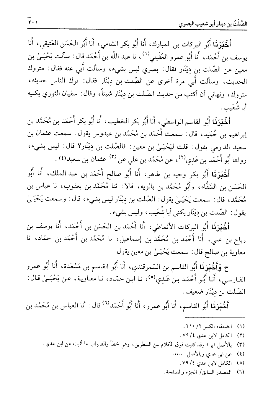 أخبرنا أبو البركات بن المبارك أنا أبو بكر الشامي أنا أبو الحسن العتيقي أنا يوسف بن أحمد أنا أبو عمرو العقيلي (1) نا عبد الله بن أحمد قال سألت يحيى بن معين عن الصلت بن دينار فقال بصري ليس بشئ وسألت أبي عنه فقال متروك الحديث وسألت أبي مرة أخرى عن الصلت بن دينار فقال ترك الناس حديثه متروك ونهاني أن أكتب من حديث الصلت بن دينار شيئا وقال سفيان الثوري يكنيه أبا شعيب أخبرنا أبو القاسم الواسطي أنا أبو بكر الخطيب أنا أبو بكر أحمد بن محمد بن إبراهيم بن حميد قال سمعت أحمد بن محمد بن عبدوس يقول سمعت عثمان بن سعيد الدارمي يقول قلت ليحيى بن معين فالصلت بن دينار قال ليس بشئ رواها أبو أحمد بن عدي (2) عن محمد بن علي عن (3) عثمان بن سعيد (4)