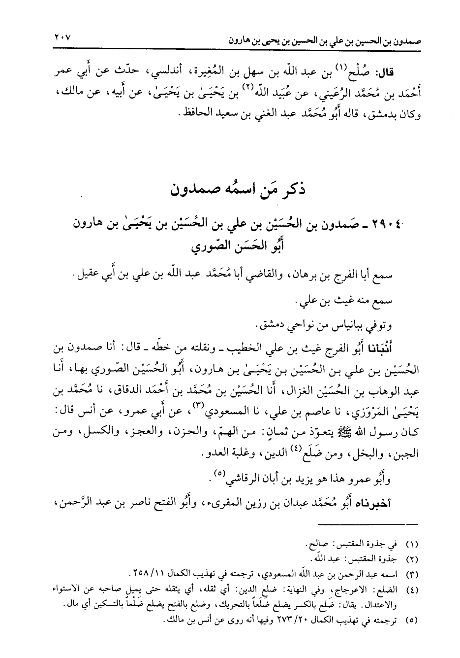 قال صلح (1) بن عبد الله بن سهل بن المغيرة أندلسي حدث عن أبي عمر أحمد بن محمد الرعيني عن عبيد الله (2) بن يحيى بن يحيى عن أبيه عن مالك وكان بدمشق قاله أبو محمد عبد الغني بن سعيد الحافظ / ذكر من اسمه صمدون /