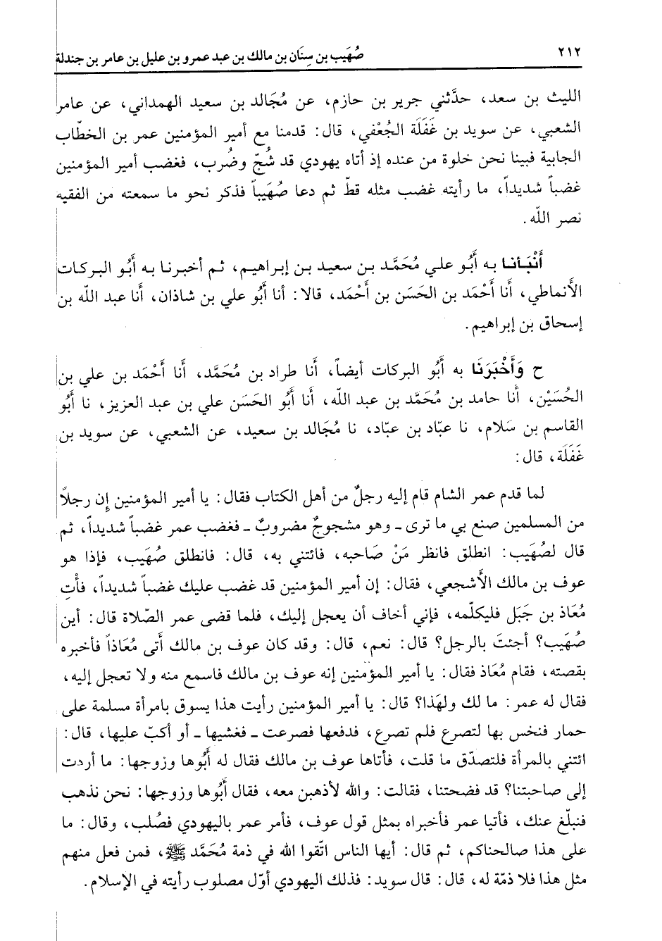 الليث بن سعد حدثني جرير بن حازم عن مجالد بن سعيد الهمداني عن عامر الشعبي عن سويد بن غفلة الجعفي قال قدمنا مع أمير المؤمنين عمر بن الخطاب الجابية فبينا نحنخلوة من عنده إذ أتاه يهودي قد شج وضرب فغضب أمير المؤمنين غضبا شديدا ما رأيته غضب مثله قط ثم دعا صهيبا فذكر نحو ما سمعته من الفقيه نصر الله أنبأنا به أبو علي محمد بن سعيد بن إبراهيم ثم أخبرنا به أبو البركات الأنماطي أنا أحمد بن الحسن بن أحمد قالا أنا أبو علي بن شاذان أنا عبد الله بن إسحاق بن إبراهيم ح وأخبرنا به أبو البركات أيضا أنا طراد بن محمد أنا أحمد بن علي بن الحسين أنا حامد بن محمد بن عبد الله أنا أبو الحسن علي بن عبد العزيز نا أبو القاسم بن سلام نا عباد بن عباد نا مجالد بن سعيد عن الشعبي عن سويد بن غفلة قال لما قدم عمر الشام قام إليه رجل من أهل الكتاب فقال يا أمير المؤمنين إن رجلا من المسلمين صنع بي ما ترى وهو مشجوح مضروب فغضب عمر غضبا شديدا ثم قال لصهيب انطلق فانظر من صاحبه فائتني به قال فانطلق صهيب فإذا هو عوف بن مالك الأشجعي فقال إن أمير المؤمنين قد غضب عليك غضبا شديدا فأت معاذ بن جبل فليكلمه فإني أخاف أن يعجل إليك فلما قضى عمر الصلاة قال أين صهيب أجئت بالرجل قال نعم قال وقد كان عوف بن مالك أتى معاذا فأخبره بقصته فقام معاذ فقال يا أمير المؤمنين إنه عوف بن مالك فاسمع منه ولا تعجل إليه فقال له عمر ما لك ولهذا قال يا أمير المؤمنين رأيت هذا يسوق بامرأة مسلمة على حمار فنخس بها لتصرع فلم تصرع فدفعها فصرعت فغشيها أو أكب عليها قال ائتني بالمرأة فلتصدق ما قلت فأتاها عوف بن مالك فقال له أبوها وزوجها ما أردت إلى صاحبتنا قد فضحتنا فقالت والله لأذهبن معه فقال أبوها وزوجها نحن نذهب فنبلغ عنك فأتيا عمر فأخبراه بمثل قول عوف فأمر عمر باليهودي فصلب وقال ما على هذا صالحناكم ثم قال أيها الناس اتقوا الله في ذمة محمد (صلى الله عليه وسلم) فمن فعل منهم مثل هذا فلا ذمة له قال قال سويد فذلك اليهودي أول مصلوب رأيته في الإسلام