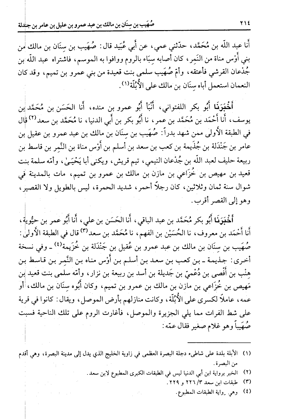 أخبرنا أبو بكر اللفتواني أنبأ أبو عمرو بن منده أنا الحسن بن محمد بن يوسف أنا أحمد بن محمد بن عمر نا أبو بكر بن أبي الدنيا نا محمد بن سعد (2) قال في الطبقة الأولى ممن شهد بدرا صهيب بن سنان بن مالك بن عبد عمرو بن عقيل بن عامر بن جندلة بن جذيمة بن كعب بن سعد بن أسلم بن أوس مناة بن النمر بن قاسط بن ربيعة حليف لعبد الله بن جدعان التيمي تيم قريش ويكنى أبا يحيى وأمه سلمة بنت قعيد بن مهيص بن خزاعي بن مازن بن مالك بن عمرو بن تميم مات بالمدينة في شوال سنة ثمان وثلاثين كان رجلا أحمر شديد الحمرة ليس بالطويل ولا القصير وهو إلى القصر أقرب أخبرنا أبو بكر محمد بن عبد الباقي أنا الحسن بن علي أنا أبو عمر بن حيوية أنا أحمد بن معروف نا الحسين بن الفهم نا محمد بن سعد (3) قال في الطبقة الأولى صهيب بن سنان بن مالك بن عبد عمرو بن عقيل بن جندلة بن جزيمة (4) وفي نسخة أخرى جذيمة بن كعب بن سعد بن أسلم بن أوس مناة بن النمر بن قاسط بن هنب بن أفصى بن دعمي بن جديلة بن أسد بن ربيعة بن نزار وأمه سلمى بنت قعيد بن مهيص بن خزاعي بن مازن بن مالك بن عمرو بن تميم وكان أبوه سنان بن مالك أو عمه عاملا لكسرى على الأبلة وكانت منازلهم بأرض الموصل ويقال كانوا في قرية على شط الفرات مما يلي الجزيرة والموصل فأغارت الروم على تلك الناحية فسبت صهيبا وهو غلام صغير فقال عمه
