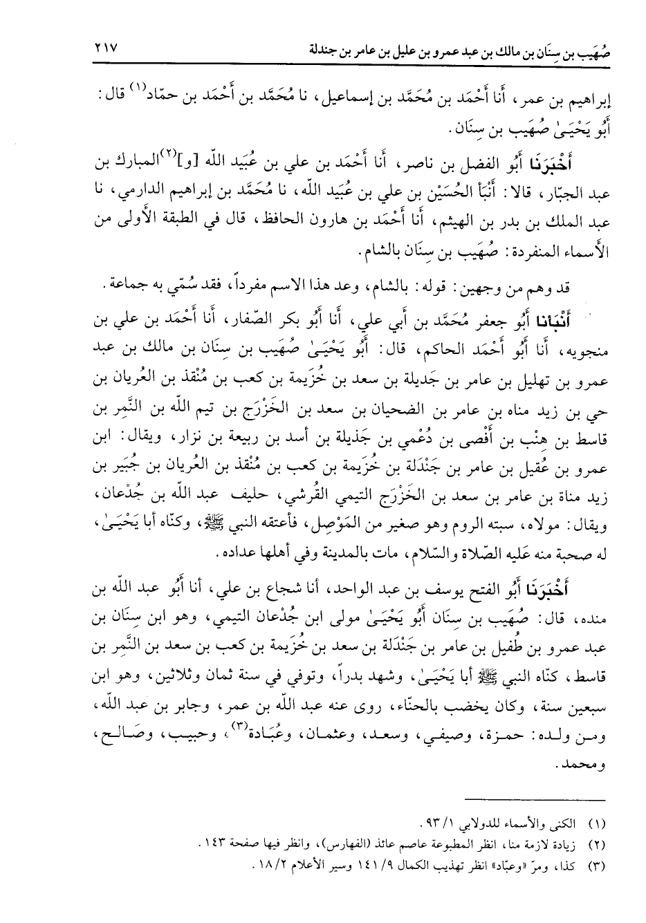 إبراهيم بن عمر أنا أحمد بن محمد بن إسماعيل نا محمد بن أحمد بن حماد (1) قال أبو يحيى صهيب بن سنان أخبرنا أبو الفضل بن ناصر أنا أحمد بن علي بن عبيد الله و (2) المبارك بن عبد الجبار قالا أنبأ الحسين بن علي بن عبيد الله نا محمد بن إبراهيم الدارمي نا عبد الملك بن بدر بن الهيثم أنا أحمد بن هارون الحافظ قال في الطبقة الأولى من الأسماء المنفردة صهيب بن سنان بالشام قد وهم من وجهين قوله بالشام وعد هذا الاسم مفردا فقد سمي به جماعة أنبأنا أبو جعفر محمد بن أبي علي أنا أبو بكر الصفار أنا أحمد بن علي بن منجويه أنا أبو أحمد الحاكم قال أبو يحيى صهيب بن سنان بن مالك بن عبد عمرو بن تهليل بن عامر بن جديلة بن سعد بن خزيمة بن كعب بن منقذ بن العريان بن حي بن زيد مناه بن عامر بن الضحيان بن سعد بن الخزرج بن تيم الله بن النمر بن قاسط بن هنب بن أفصى بن دعمي بن جذيلة بن أسد بن ربيعة بن نزار ويقال ابن عمرو بن عقيل بن عامر بن جندلة بن خزيمة بن كعب بن منقذ بن العريان بن جبير بن زيد مناة بن عامر بن سعد بن الخزرج التيمي القرشي حليف عبد الله بن جدعان ويقال مولاه سبته الروم وهو صغير من الموصل فأعتقه النبي (صلى الله عليه وسلم) وكناه أبا يحيى له صحبة منه عليه الصلاة والسلام مات بالمدينة وفي أهلها عداده أخبرنا أبو الفتح يوسف بن عبد الواحد أنا شجاع بن علي أنا أبو عبد الله بن منده قال صهيب بن سنان أبو يحيى مولى ابن جدعان التيمي وهو ابن سنان بن عبد عمرو بن طفيل بن عامر بن جندلة بن سعد بن خزيمة بن كعب بن سعد بن النمر بن قاسط كناه النبي (صلى الله عليه وسلم) أبا يحيى وشهد بدرا وتوفي في سنة ثمان وثلاثين وهو ابن سبعين سنة وكان يخضب بالحناء روى عنه عبد الله بن عمر وجابر بن عبد الله ومن ولده حمزة وصيفي وسعد وعثمان وعبادة (3) وحبيب وصالح ومحمد