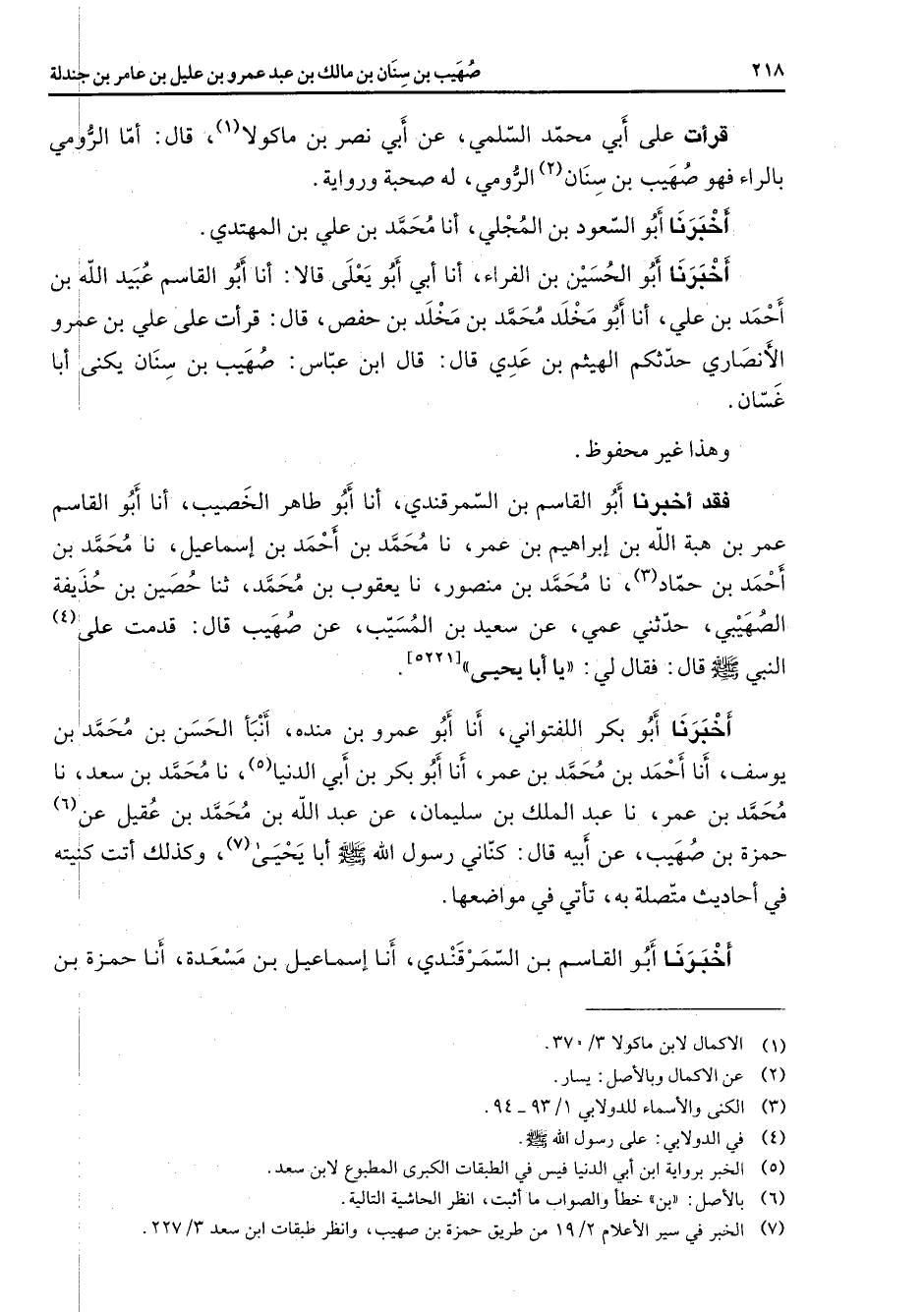 قرأت على أبي محمد السلمي عن أبي نصر بن ماكولا (1) قال أما الرومي بالراء فهو صهيب بن سنان (2) الرومي له صحبة ورواية أخبرنا أبو السعود بن المجلي أنا محمد بن علي بن المهتدي أخبرنا أبو الحسين بن الفراء أنا أبي أبو يعلى قالا أنا أبو القاسم عبيد الله بن أحمد بن علي أنا أبو مخلد محمد بن مخلد بن حفص قال قرأت على علي بن عمرو الأنصاري حدثكم الهيثم بن عدي قال قال ابن عباس صهيب بن سنان يكنى أبا غسان وهذا غير محفوظ فقد أخبرنا أبو القاسم بن السمرقندي أنا أبو طاهر الخصيب أنا أبو القاسم عمر بن هبة الله بن إبراهيم بن عمر نا محمد بن أحمد بن إسماعيل نا محمد بن أحمد بن حماد (3) نا محمد بن منصور نا يعقوب بن محمد ثنا حصين بن حذيفة الصهيبي حدثني عمي عن سعيد بن المسيب عن صهيب قال قدمت على (4) النبي (صلى الله عليه وسلم) قال فقال لي يا أبا يحيى أخبرنا أبو بكر اللفتواني أنا أبو عمرو بن منده أنبأ الحسن بن محمد بن يوسف أنا أحمد بن محمد بن عمر أنا أبو بكر بن أبي الدنيا (5) نا محمد بن سعد نا محمد بن عمر نا عبد الملك بن سليمان عن عبد الله بن محمد بن عقيل عن (6) حمزة بن صهيب عن أبيه قال كناني رسول الله (صلى الله عليه وسلم) أبا يحيى (7) وكذلك أنت كنيته في أحاديث متصلة به تأتي في مواضعها أخبرنا أبو القاسم بن السمرقندي أنا إسماعيل بن مسعدة أنا حمزة بن