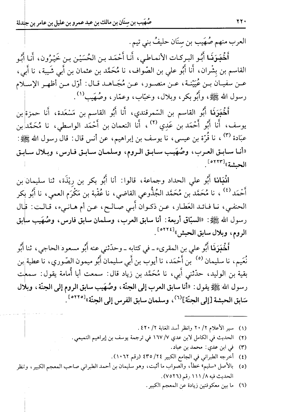 أخبرنا أبو القاسم بن السمرقندي أنا أبو القاسم بن مسعدة أنا حمزة بن يوسف أنا أبو أحمد بن عدي (2) أنا النعمان بن أحمد الواسطي نا محمد بن عبادة (3) نا قرة بن عيسى نا يوسف بن إبراهيم عن أنس قال قال رسول الله (صلى الله عليه وسلم) أنا سابق العرب وصهيب سابق الروم وسلمان سابق فارس وبلال سابق الحبشة أنبأنا أبو علي الحداد وجماعة قالوا أنا أبو بكر بن ريذة ثنا سليمان بن أحمد (4) نا محمد بن محمد الجذوعي القاضي نا عقبة بن مكرم العمي نا أبو بكر الحنفي نا فائد العطار عن ذكوان أبي صالح عن أم هانئ قالت قال رسول الله (صلى الله عليه وسلم) السباق أربعة أنا سابق العرب وسلمان سابق فارس وصهيب سابق الروم وبلال سابق الحبش أخبرنا أبو علي بن المقرئ في كتابه وحدثني عنه أبو مسعود الحاجي ثنا أبو نعيم نا سليمان (5) بن أحمد نا أيوب بن أبي سليمان أبو ميمون الصوري نا عطية بن بقية بن الوليد حدثني أبي نا محمد بن زياد قال سمعت أبا أمامة يقول سمعت رسول الله (صلى الله عليه وسلم) يقول أنا سابق العرب إلى الجنة وصهيب سابق الروم إلى الجنة وبلال سابق الحبشة إلى الجنة (6) وسلمان سابق فارس إلى الجنة