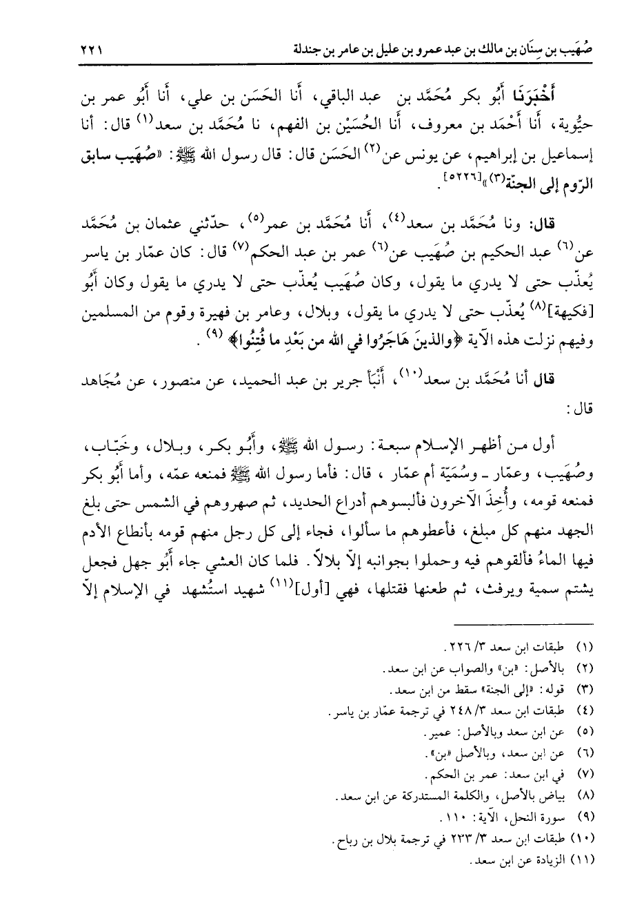 أخبرنا أبو بكر محمد بن عبد الباقي أنا الحسن بن علي أنا أبو عمر بن حيوية أنا أحمد بن معروف أنا الحسين بن الفهم نا محمد بن سعد (1) قال أنا إسماعيل بن إبراهيم عن (2) يونس عن الحسن قال قال رسول الله (صلى الله عليه وسلم) صهيب سابق الروم إلى الجنة (3) قال ونا محمد بن سعد (4) أنا محمد بن عمر (5) حدثني عثمان بن محمد عن (6) عبد الحكيم بن صهيب عن (6) عمر بن عبد الحكم (7) قال كان عمار بن ياسر يعذب حتى لا يدري ما يقول وكان صهيب يعذب حتى لا يدري ما يقول وكان أبو فكيهة (8) يعذب حتى لا يدري ما يقول وبلال وعامر بن فهيرة وقوم من المسلمين وفيهم نزلت هذه الآية " والذين هاجروا في الله من بعد ما فتنوا " (9)