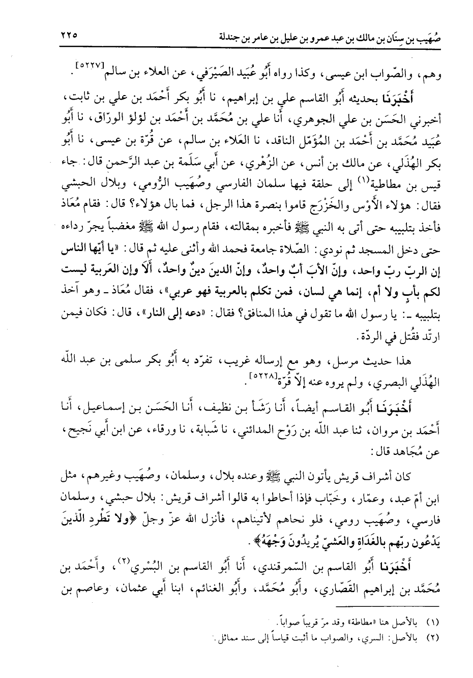 وهم والصواب ابن عيسى وكذا رواه أبو عبيد الصيرفي عن العلاء بن سالم أخبرنا بحديثه أبو القاسم علي بن إبراهيم نا أبو بكر أحمد بن علي بن ثابت أخبرني الحسن بن علي الجوهري أنا علي بن محمد بن أحمد بن لؤلؤ الوراق نا أبو عبيد محمد بن أحمد بن المؤمل الناقد نا العلاء بن سالم عن قرة بن عيسى نا أبو بكر الهذلي عن مالك بن أنس عن الزهري عن أبي سلمة بن عبد الرحمن قال جاء قيس بن مطاطية (1) إلى حلقة فيها سلمان الفارسي وصهيب الرومي وبلال الحبشي فقال هؤلاء الأوس والخزرج قاموا بنصرة هذا الرجل فما بال هؤلاء قال فقام معاذ فأخذ بتلبيبه حتى أتى به النبي (صلى الله عليه وسلم) فأخبره بمقالته فقام رسول الله (صلى الله عليه وسلم) مغضبا يجر رداءه حتى دخل المسجد ثم نودي الصلاة جامعة فحمد الله وأثنى عليه ثم قال يا أيها الناس إن الرب رب واحد وإن الأب أب واحد وإن الدين دين واحد ألا وإن العربية ليست لكم بأب ولا أم إنما هي لسان فمن تكلم بالعربية فهو عربي فقال معاذ وهو آخذ بتلبيبه يا رسول الله ما تقول في هذا المنافق فقال دعه إلى النار قال فكان فيمن ارتد فقتل في الردة هذا حديث مرسل وهو مع إرساله غريب تفرد به أبو بكر سلمى بن عبد الله الهذلي البصري ولم يروه عنه إلا قرة أخبرنا أبو القاسم أيضا أنا رشأ بن نظيف أنا الحسن بن إسماعيل أنا أحمد بن مروان ثنا عبد الله بن روح المدائني نا شبابة نا ورقاء عن ابن أبي نجيح عن مجاهد قال كان أشراف قريش يأتون النبي (صلى الله عليه وسلم) وعنده بلال وسلمان وصهيب وغيرهم مثل ابن أم عبد وعمار وخباب فإذا أحاطوا به قالوا أشراف قريش بلال حبشي وسلمان فارسي وصهيب رومي فلو نحاهم لأتيناهم فأنزل الله عز وجل (ولا تطرد الذين يدعون ربهم بالغداة والعشي يريدون وجهه) أخبرنا أبو القاسم بن السمرقندي أنا أبو القاسم بن البسري (2) وأحمد بن محمد بن إبراهيم القصاري وأبو محمد وأبو الغنائم ابنا أبي عثمان وعاصم بن