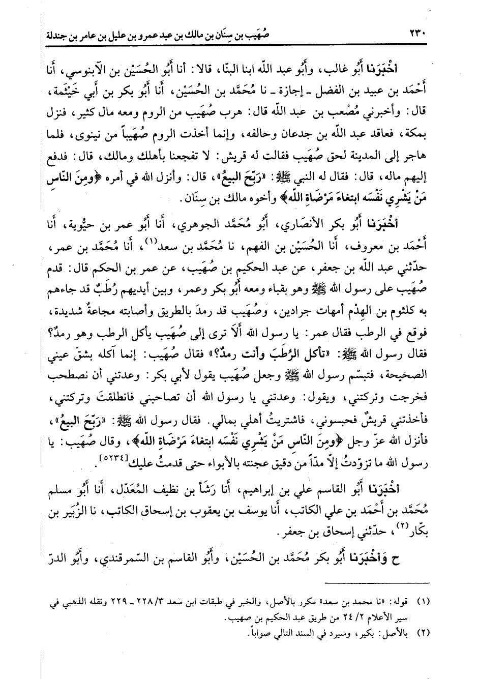أخبرنا أبو غالب وأبو عبد الله ابنا البنا قالا أنا أبو الحسين بن الآبنوسي أنا أحمد بن عبيد بن الفضل إجازة نا محمد بن الحسين أنا أبو بكر بن أبي خيثمة قال وأخبرني مصعب بن عبد الله قال هرب صهيب من الروم ومعه مال كثير فنزل بمكة فعاقد عبد الله بن جدعان وحالفه وإنما أخذت الروم صهيبا من نينوى فلما هاجر إلى المدينة لحق صهيب فقالت له قريش لا تفجعنا بأهلك ومالك قال فدفع إليهم ماله قال فقال له النبي (صلى الله عليه وسلم) ربح البيع قال وأنزل الله في أمره " ومن الناس من يشري نفسه ابتغاء مرضاة الله " وأخوه مالك بن سنان أخبرنا أبو بكر الأنصاري أبو محمد الجوهري أنا أبو عمر بن حيوية أنا أحمد بن معروف أنا الحسين بن الفهم نا محمد بن سعد (1) أنا محمد بن عمر حدثني عبد الله بن جعفر عن عبد الحكيم بن صهيب عن عمر بن الحكم قال قدم صهيب على رسول الله (صلى الله عليه وسلم) وهو بقباء ومعه أبو بكر وعمر وبين أيديهم رطب قد جاءهم به كلثوم بن الهدم أمهات جرادين وصهيب قد رمد بالطريق وأصابته مجاعة شديدة فوقع في الرطب فقال عمر يا رسول الله ألا ترى إلى صهيب يأكل الرطب وهو رمد فقال رسول الله (صلى الله عليه وسلم) تأكل الرطب وأنت رمد فقال صهيب إنما آكله بشق عيني الصحيحة فتبسم رسول الله (صلى الله عليه وسلم) وجعل صهيب يقول لأبي بكر وعدتني أن نصطحب فخرجت وتركتني ويقول وعدتني يا رسول الله أن تصاحبني فانطلقت وتركتني فأخذتني قريش فحبسوني فاشتريت أهلي بمالي فقال رسول الله (صلى الله عليه وسلم) ربح البيع فأنزل الله عز وجل " ومن الناس من يشري نفسه ابتغاء مرضاة الله " وقال صهيب يا رسول الله ما تزودت إلا مدا من دقيق عجنته بالأبواء حتى قدمت عليك أخبرنا أبو القاسم علي بن إبراهيم أنا رشأ بن نظيف المعدل أنا أبو مسلم محمد بن أحمد بن علي الكاتب أنا يوسف بن يعقوب بن إسحاق الكاتب نا الزبير بن بكار (2) حدثني إسحاق بن جعفر ح وأخبرنا أبو بكر محمد بن الحسين وأبو القاسم بن السمرقندي وأبو الدر