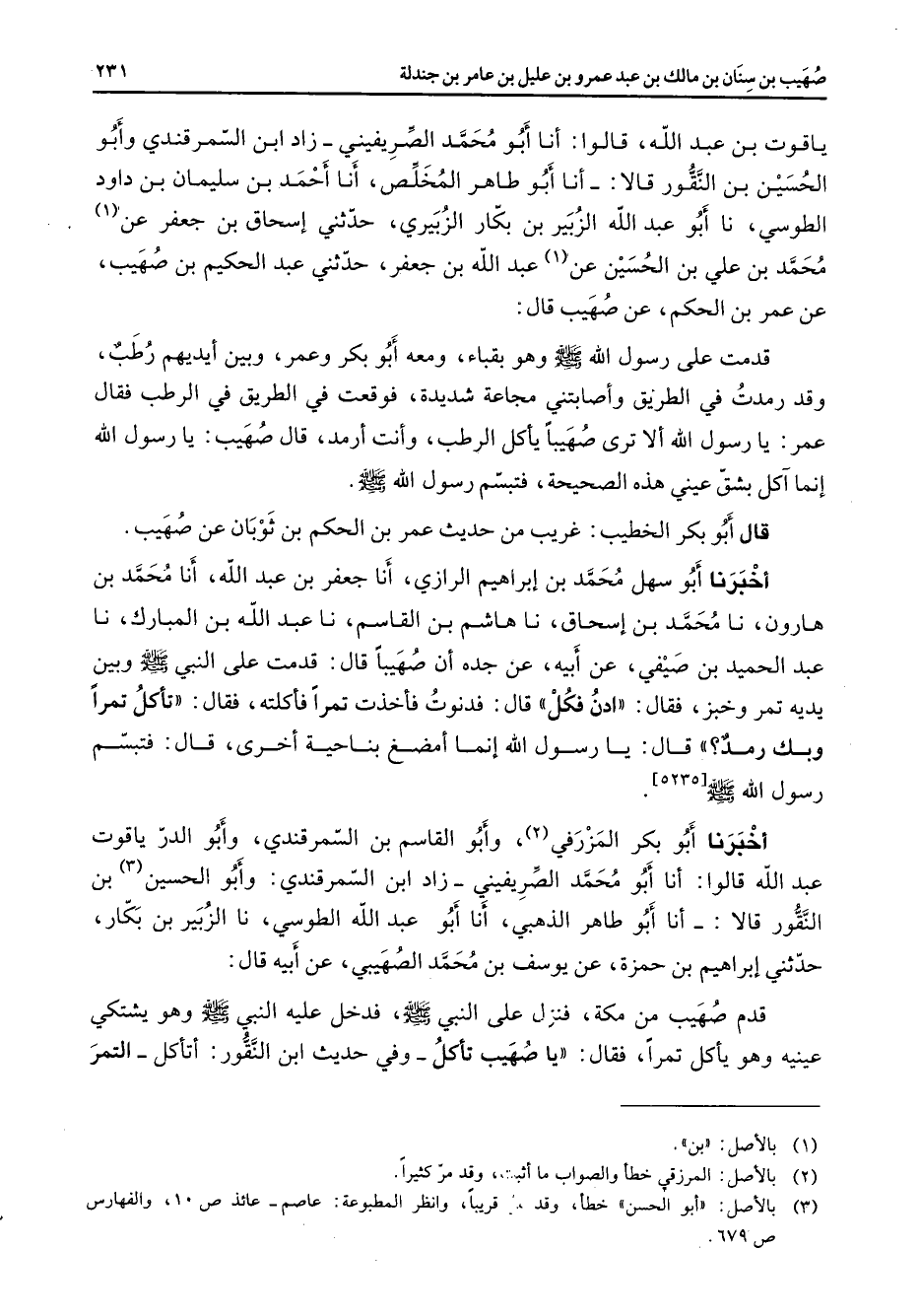 ياقوت بن عبد الله قالوا أنا أبو محمد الصريفيني زاد ابن السمرقندي وأبو الحسين بن النقور قالا أنا أبو طاهر المخلص أنا أحمد بن سليمان بن داود الطوسي نا أبو عبد الله الزبير بن بكار الزبيري حدثني إسحاق بن جعفر عن (1) محمد بن علي بن الحسين عن (1) عبد الله بن جعفر حدثني عبد الحكيم بن صهيب عن عمر بن الحكم عن صهيب قال قدمت على رسول الله (صلى الله عليه وسلم) وهو بقباء ومعه أبو بكر وعمر وبين أيديهم رطب وقد رمدت في الطريق وأصابتني مجاعة شديدة فوقعت في الطريق في الرطب فقال عمر يا رسول الله ألا ترى صهيبا يأكل الرطب وأنت أرمد قال صهيب يا رسول الله إنما آكل بشق عيني هذه الصحيحة فتبسم رسول الله (صلى الله عليه وسلم) قال أبو بكر الخطيب غريب من حديث عمر بن الحكم بن ثوبان عن صهيب أخبرنا أبو سهل محمد بن إبراهيم الرازي أنا جعفر بن عبد الله أنا محمد بن هارون نا محمد بن إسحاق نا هاشم بن القاسم نا عبد الله بن المبارك نا عبد الحميد بن صيفي عن أبيه عن جده أن صهيبا قال قدمت على النبي (صلى الله عليه وسلم) وبين يديه تمر وخبز فقال ادن فكل قال فدنوت فأخذت تمرا فأكلته فقال تأكل تمرا وبك رمد فقال يا رسول الله إنما أمضغ بناحية أخرى قال فتبسم رسول الله (صلى الله عليه وسلم) أخبرنا أبو بكر المزرقي (2) وأبو القاسم بن السمرقندي وأبو الدر ياقوت عبد الله قالوا أنا أبو محمد الصريفيني زاد ابن السمرقندي وأبو الحسين (3) بن النقور قالا أنا أبو طاهر الذهبي أنا أبو عبد الله الطوسي نا الزبير بن بكار حدثني إبراهيم بن حمزة عن يوسف بن محمد الصهيبي عن أبيه قال قدم صهيب من مكة فنزل على النبي (صلى الله عليه وسلم) فدخل عليه النبي (صلى الله عليه وسلم) وهو يشتكي عينيه وهو يأكل تمرا فقال يا صهيب تأكل وفي حديث ابن النقور أتأكل التمر