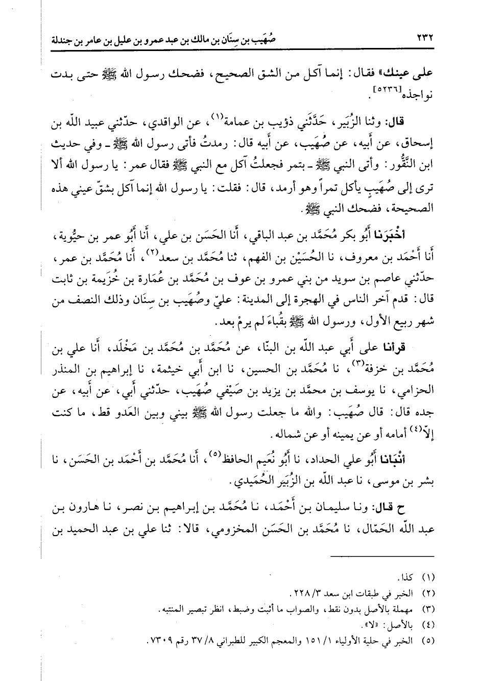 على عينك فقال إنما آكل من الشق الصحيح فضحك رسول الله (صلى الله عليه وسلم) حتى بدت نواجذه قال وثنا الزبير حدثني ذؤيب بن عمامة (1) عن الواقدي حدثني عبيد الله بن إسحاق عن أبيه عن صهيب عن أبيه قال رمدت فأتى رسول الله (صلى الله عليه وسلم) وفي حديث ابن النقور وأتى النبي (صلى الله عليه وسلم) بتمر فجعلت آكل مع النبي (صلى الله عليه وسلم) فقال عمر يا رسول الله ألا ترى إلى صهيب يأكل تمرا وهو أرمد قال فقلت يا رسول الله إنما آكل بشق عيني هذه الصحيحة فضحك النبي (صلى الله عليه وسلم) أخبرنا أبو بكر محمد بن عبد الباقي أنا الحسن بن علي أنا أبو عمر بن حيوية أنا أحمد بن معروف نا الحسين بن الفهم ثنا محمد بن سعد (2) أنا محمد بن عمر حدثني عاصم بن سويد من بني عمرو بن عوف بن محمد بن عمارة بن خزيمة بن ثابت قال قدم آخر الناس في الهجرة إلى المدينة علي وصهيب بن سنان وذلك النصف من شهر ربيع الأول ورسول الله (صلى الله عليه وسلم) بقباء لم يرم بعد قرأنا على أبي عبد الله بن البنا عن محمد بن محمد بن مخلد أنا علي بن محمد بن خزفة (3) نا محمد بن الحسين نا ابن أبي خيثمة نا إبراهيم بن المنذر الحزامي نا يوسف بن محمد بن يزيد بن صيفي صهيب حدثني أبي عن أبيه عن جده قال قال صهيب والله ما جعلت رسول الله (صلى الله عليه وسلم) بيني وبين العدو قط ما كنت إلا (4) أمامه أو عن يمينه أو عن شماله أنبأنا أبو علي الحداد نا أبو نعيم الحافظ (5) أنا محمد بن أحمد بن الحسن نا بشر بن موسى نا عبد الله بن الزبير الحميدي ح قال ونا سليمان بن أحمد نا محمد بن إبراهيم بن نصر نا هارون بن عبد الله الحمال نا محمد بن الحسن المخزومي قالا ثنا علي بن عبد الحميد بن