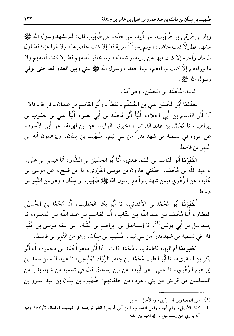 زياد بن صيفي بن صهيب عن أبيه عن جده عن صهيب قال لم يشهد رسول الله (صلى الله عليه وسلم) مشهدا قط إلا كنت حاضره ولم (1) يسر سرية قط إلا كنت حاضرها ولا غزا غزاة قط أول الزمان وآخره إلا كنت فيها عن يمينه أو شماله وما خافوا أمامهم قط إلا كنت أمامهم ولا ما وراءهم إلا كنت وراءهم وما جعلت رسول الله (صلى الله عليه وسلم) بيني وبين العدو قط حتى توفي رسول الله (صلى الله عليه وسلم) السند لمحمد بن الحسن وهو أتم حدثنا أبو الحسن علي بن المسلم لفظا وأبو القاسم بن عبدان قراءة قالا أنا أبو القاسم بن أبي العلاء أنبأ أبو محمد بن أبي نصر أنبأ علي بن يعقوب بن إبراهيم نا محمد بن عابذ القرشي أخبرني الوليد عن ابن لهيعة عن أبي الأسود عن عروة في تسمية من شهد بدرا من بني تيم صهيب بن سنان ويزعمون أنه من النمر بن قاسط أخبرنا أبو القاسم بن السمرقندي أنا أبو الحسين بن النقور أنا عيسى بن علي نا عبد الله بن محمد حدثني هارون بن موسى الفروي نا ابن فليح عن موسى بن عقبة عن الزهري فيمن شهد بدرا مع رسول الله (صلى الله عليه وسلم) صهيب بن سنان وهو من النمر بن قاسط أخبرنا أبو محمد بن الأكفاني نا أبو بكر الخطيب أنا محمد بن الحسين القطان أنا محمد بن عبد الله بن عتاب أنا القاسم بن عبد الله بن المغيرة نا إسماعيل بن أبي يونس (2) نا إسماعيل بن إبراهيم بن عقبة عن عمه موسى بن عقبة قال في تسمية من شهد بدرا من بني تيم صهيب بن سنان وهو من النمر بن قاسط أخبرتنا أم البهاء فاطمة بنت محمد قالت أنا أبو طاهر أحمد بن محمود أنا أبو بكر بن المقرئ نا أبو الطيب محمد بن جعفر الزراد المنبجي نا عبيد الله بن سعد بن إبراهيم الزهري نا عمي عن أبيه عن ابن إسحاق قال في تسمية من شهد بدرا من المسلمين من قريش من بني زهرة ومن حلفائهم صهيب بن سنان بن عبد عمرو بن