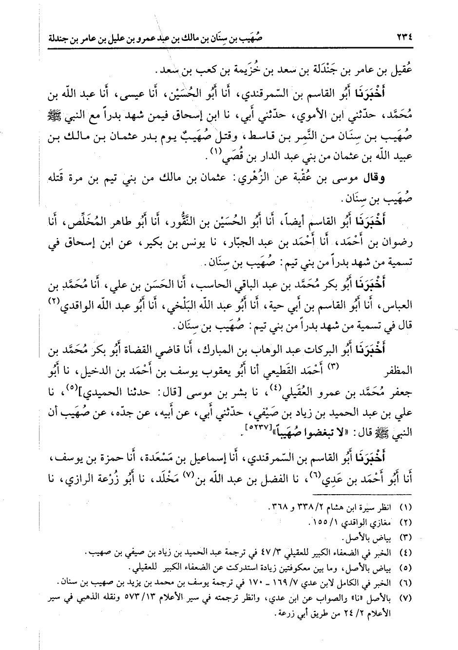 وقال موسى بن عقبة عن الزهري عثمان بن مالك من بني تيم بن مرة قتله صهيب بن سنان أخبرنا أبو القاسم أيضا أنا أبو الحسين بن النقور أنا أبو طاهر المخلص أنا رضوان بن أحمد أنا أحمد بن عبد الجبار نا يونس بن بكير عن ابن إسحاق في تسمية من شهد بدرا من بني تيم صهيب بن سنان أخبرنا أبو بكر محمد بن عبد الباقي الحاسب أنا الحسن بن علي أنا محمد بن العباس أنا أبو القاسم بن أبي حية أنا أبو عبد الله البلخي أنا أبو عبد الله الواقدي (2) قال في تسمية من شهد بدرا من بني تيم صهيب بن سنان أخبرنا أبو البركات عبد الوهاب بن المبارك أنا قاضي القضاة أبو بكر محمد بن المظفر (3) أحمد القطيعي أنا أبو يعقوب يوسف بن أحمد بن الدخيل نا أبو جعفر محمد بن عمرو العقيلي (4) نا بشر بن موسى قال حدثنا الحميدي (5) نا علي بن عبد الحميد بن زياد بن صيفي حدثني أبي عن أبيه عن جده عن صهيب أن النبي (صلى الله عليه وسلم) قال لا تبغضوا صهيبا [* * * * *] أخبرنا أبو القاسم بن السمرقندي أنا إسماعيل بن مسعدة أنا حمزة بن يوسف أنا أبو أحمد بن عدي (6) نا الفضل بن عبد الله بن (7) مخلد نا أبو زرعة الرازي نا