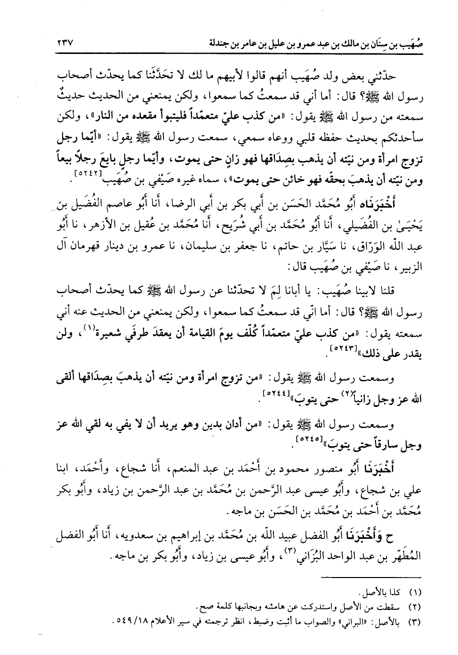حدثني بعض ولد صهيب أنهم قالوا لأبيهم ما لك لا تحدثنا كما يحدث أصحاب رسول الله (صلى الله عليه وسلم) قال أما أني قد سمعت كما سمعوا ولكن يمنعني من الحديث حديث سمعته من رسول الله (صلى الله عليه وسلم) يقول من كذب علي متعمدا فليتبوأ مقعده من النار ولكن سأحدثكم بحديث حفظه قلبي ووعاء سمعي سمعت رسول الله (صلى الله عليه وسلم) يقول أيما رجل تزوج امرأة ومن نيته أن يذهب بصداقها فهو زان حتى يموت وإيما رجل بايع رجلا بيعا ومن نيته أن يذهب بحقه فهو خائن حتى يموت سماه غير صيفي بن صهيب أخبرناه أبو محمد الحسن بن أبي بكر بن أبي الرضا أنا أبو عاصم الفضل بن يحيى بن الفضيلي أنا أبو محمد بن أبي شريح أنا محمد بن عقيل بن الأزهر نا أبو عبد الله الوراق نا سيار بن حاتم نا جعفر بن سليمان نا عمرو بن دينار قهرمان آل الزبير نا صيفي بن صهيب قال قلنا لابينا صهيب يا أبانا لم لا تحدثنا عن رسول الله (صلى الله عليه وسلم) كما يحدث أصحاب رسول الله (صلى الله عليه وسلم) قال أما اني قد سمعت كما سمعوا ولكن يمنعني من الحديث عنه أني سمعته يقول من كذب علي متعمدا كلف يوم القيامة أن يعقد طرفي شعيرة (1) ولن يقدر على ذلك وسمعت رسول الله (صلى الله عليه وسلم) يقول من تزوج امرأة ومن نيته أن يذهب بصداقها ألقى الله عز وجل زانيا (2) حتى يتوب وسمعت رسول الله (صلى الله عليه وسلم) من أدان بدين وهو يريد أن لا يفي به لقي الله عز وجل سارقا حتى يتوب أخبرنا أبو منصور محمود بن أحمد بن عبد المنعم أنا شجاع وأحمد ابنا علي بن شجاع وأبو عيسى عبد الرحمن بن محمد بن عبد الرحمن بن زياد وأبو بكر محمد بن أحمد بن محمد بن الحسن بن ماجه ح وأخبرنا أبو الفضل عبيد الله بن محمد بن إبراهيم بن سعدويه أنا أبو الفضل المطهر بن عبد الواحد البزاني (3) وأبو عيسى بن زياد وأبو بكر بن ماجه
