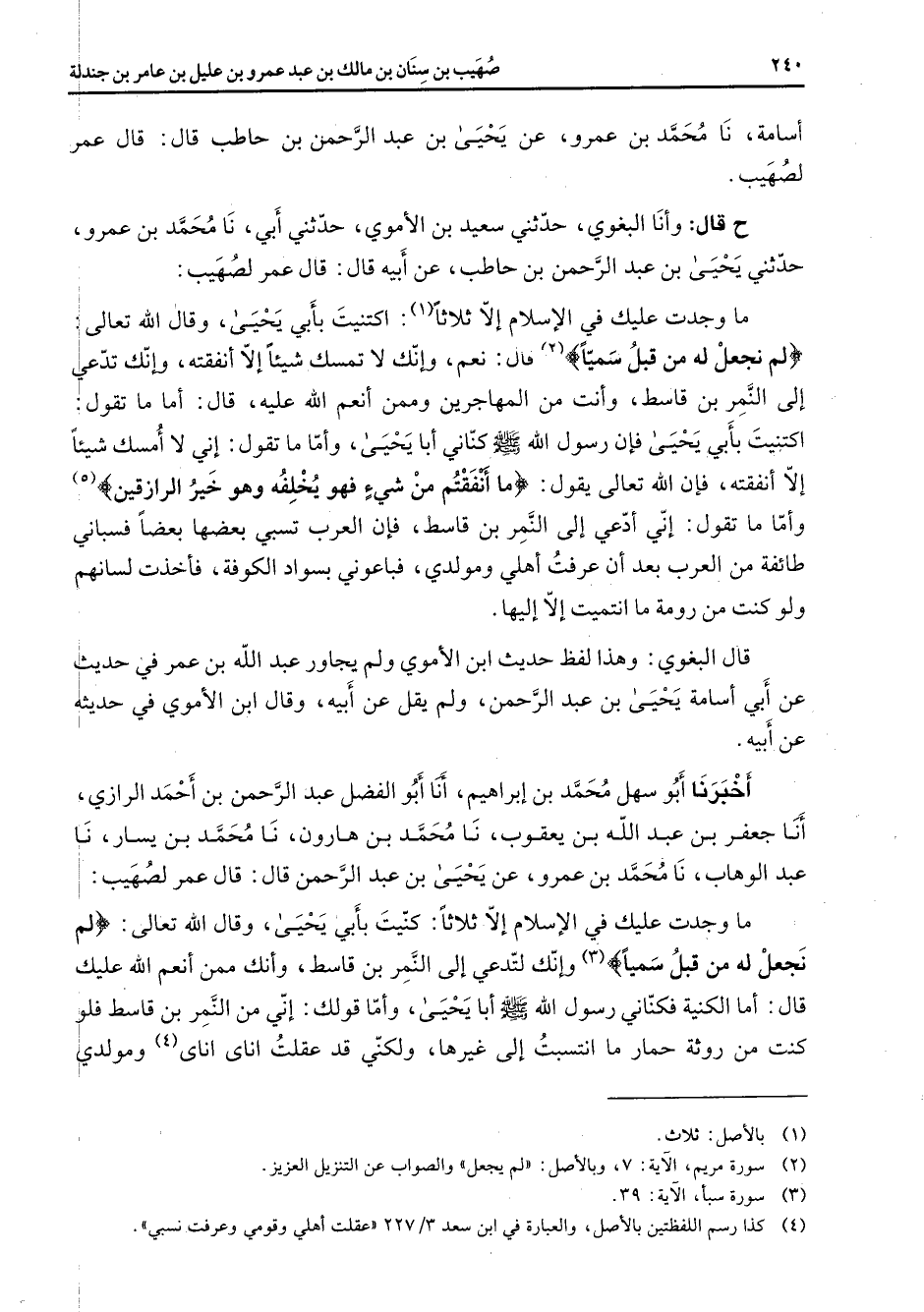 أسامة نا محمد بن عمرو عن يحيى بن عبد الرحمن بن حاطب قال قال عمر لصهيب ح قال وأنا البغوي حدثني سعيد بن الأموي حدثني أبي نا محمد بن عمرو حدثني يحيى بن عبد الرحمن بن حاطب عن أبيه قال قال عمر لصهيب ما وجدت عليك في الإسلام إلا ثلاثا اكتنيت بأبي يحيى وقال الله تعالى " لم نجعل له من قبل سميا " (2) قال نعم وإنك لا تمسك شيئا إلا أنفقته وإنك تدعي إلى النمر بن قاسط وأنت من المهاجرين وممن أنعم الله عليه قال أما ما تقول اكتنيت بأبي يحيى فإن رسول الله (صلى الله عليه وسلم) كناني أبا يحيى وأما ما تقول إني لا أمسك شيئا إلا أنفقته فإن الله تعالى يقول " ما أنفقتم من شئ فهو يخلفه وهو خير الرازقين " (5) وأما ما تقول إني أدعي إلى النمر بن قاسط فإن العرب تسبي بعضها بعضا فسباني طائفة من العرب بعد أن عرفت أهلي ومولدي فباعوني بسواد الكوفة فأخذت لسانهم