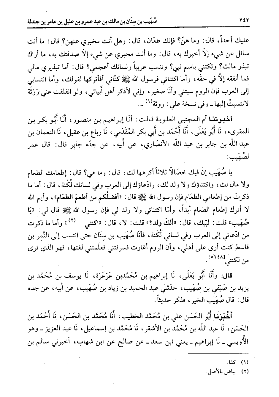 أخبرتنا أم المجتبى العلوية قالت أنا إبراهيم بن منصور أنا أبو بكر بن المقرئ نا أبو يعلى أنا أحمد بن أبي بكر المقدمي نا رباع بن عقيل نا النعمان بن عبد الله بن جابر بن عبد الله الأنصاري عن أبيه عن جده جابر قال قال عمر لصهيب يا صهيب إن فيك خصالا ثلاثا أكرهها لك قال وما هي قال إطعامك الطعام ولا مال لك واكتناؤك ولا ولد لك وادعاؤك إلى العرب وفي لسانك لكنة قال أما ما ذكرت من إطعامي الطعام فإن رسول الله (صلى الله عليه وسلم) قال أفضلكم من أطعم الطعام وأيم الله لا أترك إطعام الطعام أبدا وأما اكتنائي ولا ولد لي فإن رسول الله (صلى الله عليه وسلم) قال لي يا صهيب قلت لبيك قال ألك ولد قلت لا قال اكتني (2) وأما ما ذكرت من ادعائي إلى العرب وفي لساني لكنة فأنا صهيب بن سنان حتى انتسب إلى النمر بن قاسط كنت أرى على أهلي وأن الروم أغارت فسرقتني فعلمتني لغتها فهو الذي ترى من لكنتي قال وأنا أبو يعلى نا إبراهيم بن محمد بن عرعرة نا يوسف بن محمد بن يزيد بن صيفي بن صهيب حدثني عبد الحميد بن زياد بن صهيب عن أبيه عن جده قال قال صهيب الخير فذكر حديثا أخبرنا أبو الحسن علي بن محمد الخطيب أنا محمد بن الحسن نا أحمد بن الحسن نا عبد الله بن محمد بن الأشقر نا محمد بن إسماعيل نا عبد العزيز وهو الأويسي نا إبراهيم يعني ابن سعد عن صالح عن ابن شهاب أخبرني سالم بن