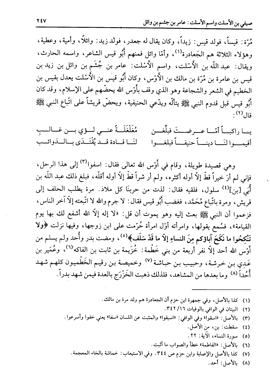 مرة قيسا فولد قيس زيدا وكان يقال له جعدر فولد زيد وائلا وأمية وعطية وهؤلاء الثلاثة هم الجعادرة (1) وأما وائل فمنهم أبو قيس الشاعر واسمه الحارث ويقال عبد الله بن الأسلت واسم الأسلت عامر بن جشم بن وائل بن زيد بن قيس بن عامرة بن مرة بن مالك بن الأوس وكان أبو قيس بن الأسلت يعدل بقيس بن الخطيم في الشعر والشجاعة وهو الذي وقف بأوس الله يحضهم على الإسلام وقد كان أبو قيس قبل قدوم النبي (صلى الله عليه وسلم) يتأله ويدعي الحنيفية ويحض قريشا على اتباع النبي (صلى الله عليه وسلم) قال (2) * يا راكبا أما عرضت فبلغن * مغلغله عني لؤي بن غالب أقيموا لنا دينا حنيفا فبلغوا * لنا قادة قد يقتدى بالذوائب * وهي قصيدة طويلة وقام في أوس الله تعالى فقال اسفوا (3) إلى هذا الرجل فإني لم أر خيرا قط إلا أوله أكثره ولم أر شرا قط إلا أوله أقله فبلغ ذلك عبد الله بن أبي بن (4) سلول فلقيه فقال لذت من حربنا كل ملاذ مرة يطلب الحلف إلى قريش ومرة باتباع محمد فغضب أبو قيس فقال لا جرم والله لا اتبعته إلا آخر الناس فزعموا أن النبي (صلى الله عليه وسلم) بعث إليه وهو يموت أن قل لا إله إلا الله أشفع لك بها يوم القيامة فسمع يقولها وامرأته أول امرأة حرمت على ابن زوجها وفيها نزلت " ولا تنكحوا ما نكح آباؤكم من النساء إلا ما قد سلف " (5) ومضت بدر وأحد ولم يسلم من أوس الله أحدا إلا نفر أربعة من بني خطمة خزيمة بن ثابت بن الفاكه (6) وعمير بن عدي بن خرشة وحبيب بن حباشة (7) وخميصة بن رقيم الخطميون كلهم شهد أحدا (8) وما بعدها من المشاهد فلذلك ذهبت الخزرج بالعدة فيمن شهد بدرا