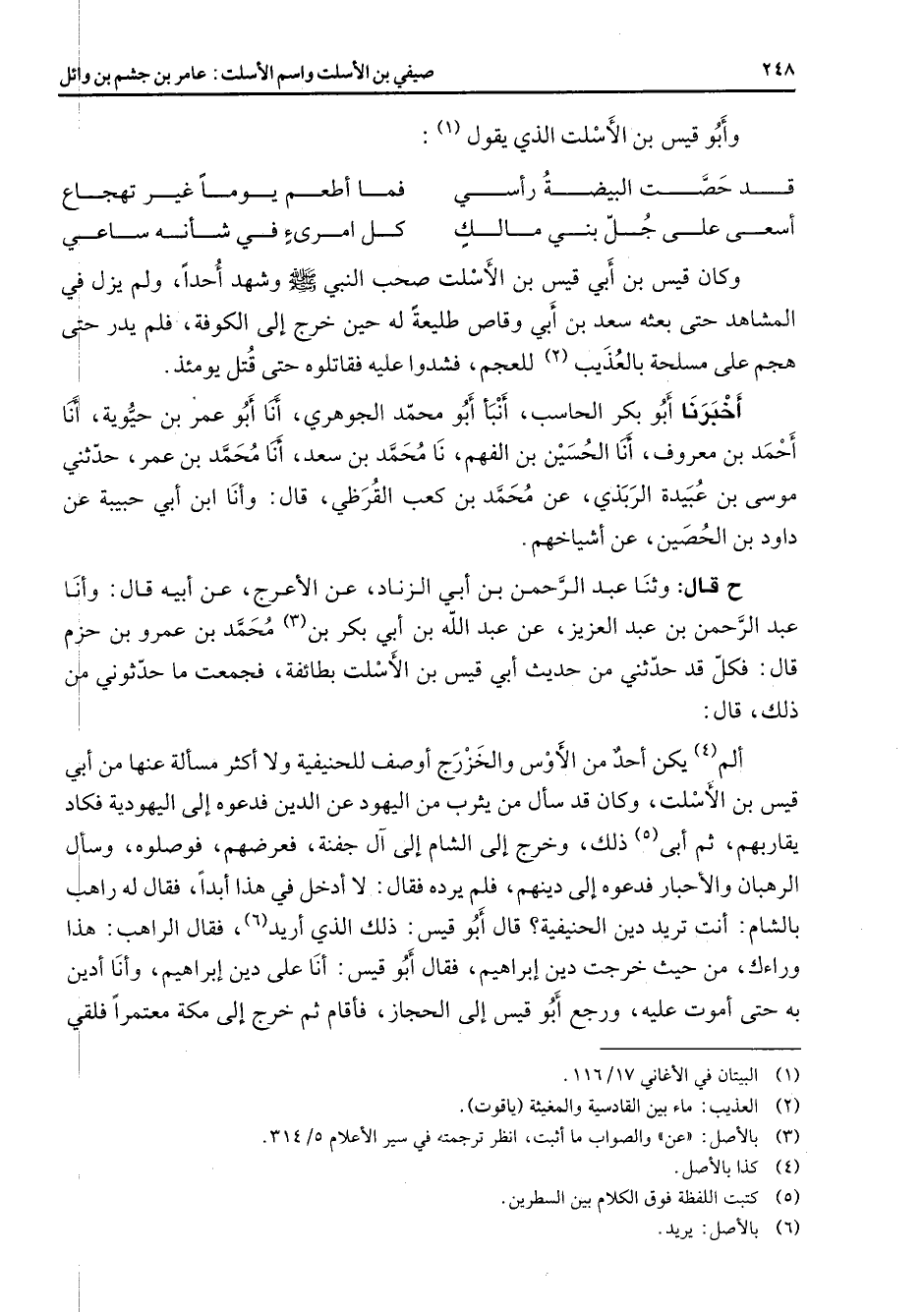 وأبو قيس بن الأسلت الذي يقول (1) : * قد حصت البيضة رأسي * فما أطعم يوما غير تهجاع أسعى على جل بني مالك * كل امرئ في شأنه ساعي * وكان قيس بن أبي قيس بن الأسلت صحب النبي (صلى الله عليه وسلم) وشهد أحدا ولم يزل في المشاهد حتى بعثه سعد بن أبي وقاص طليعة له حين خرج إلى الكوفة فلم يدر حتى هجم على مسلحة بالعذيب (2) للعجم فشدوا عليه فقاتلوه حتى قتل يومئذ أخبرنا أبو بكر الحاسب أنبأ أبو محمد الجوهري أنا أبو عمر بن حيوية أنا أحمد بن معروف أنا الحسين بن الفهم نا محمد بن سعد أنا محمد بن عمر حدثني موسى بن عبيدة الربذي عن محمد بن كعب القرظي قال وأنا ابن أبي حبيبة عن داود بن الحصين عن أشياخهم ح قال وثنا عبد الرحمن بن أبي الزناد عن الأعرج عن أبيه قال وأنا عبد الرحمن بن عبد العزيز عن عبد الله بن أبي بكر بن (3) محمد بن عمرو بن حزم قال فكل قد حدثني من حديث أبي قيس بن الأسلت بطائفة فجمعت ما حدثوني من ذلك قال ألم (4) يكن أحد من الأوس والخزرج أوصف للحنيفية ولا أكثر مسألة عنها من أبي قيس بن الأسلت وكان قد سأل من يثرب من اليهود عن الذين فدعوه إلى اليهودية فكاد يقاربهم ثم أبى (5) ذلك وخرج إلى الشام إلى آل جفنة فعرضهم فوصلوه وسأل الرهبان والأحبار فدعوه إلى دينهم فلم يرده فقال لا أدخل في هذا أبدا فقال له واهب بالشام أنت تريد دين الحنيفية قال أبو قيس ذلك الذي أريد (6) فقال الراهب هذا وراءك من حيث خرجت دين إبراهيم فقال أبو قيس أنا على دين إبراهيم وأنا أدين به حتى أموت عليه ورجع أبو قيس إلى الحجاز فأقام ثم خرج إلى مكة معتمرا فلقي