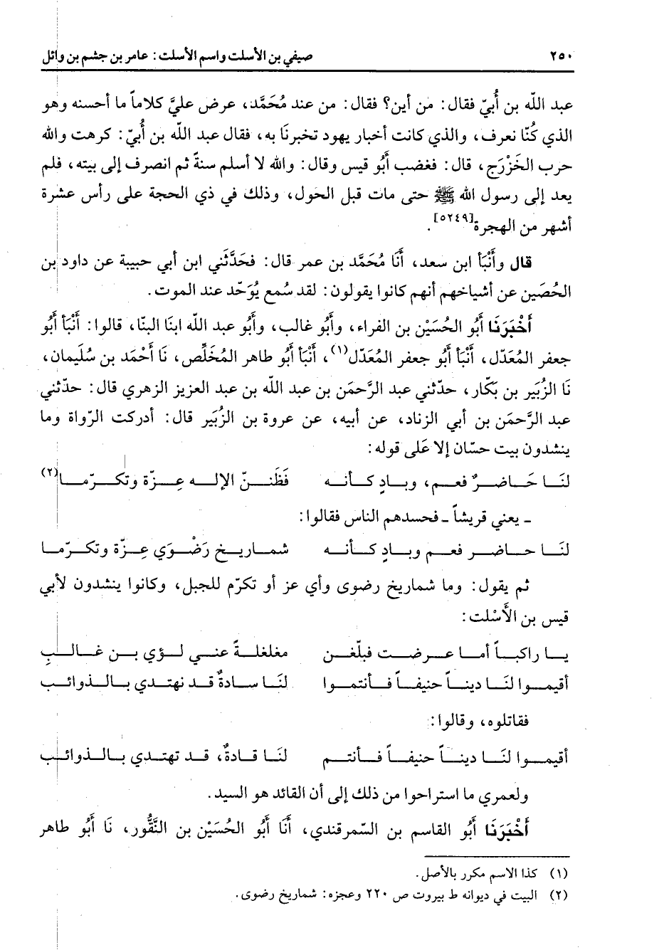 عبد الله بن أبي فقال من أين فقال من عند محمد عرض علي كلاما ما أحسنه وهو الذي كنا نعرف والذي كانت أخبار يهود تخبرنا به فقال عبد الله بن أبي كرهت والله حرب الخزرج قال فغضب أبو قيس وقال والله لا أسلم سنة ثم انصرف إلى بيته فلم يعد إلى رسول الله (صلى الله عليه وسلم) حتى مات قبل الحول وذلك في ذي الحجة على رأس عشرة أشهر من الهجرة قال وأنبأ ابن سعد أنا محمد بن عمر قال فحدثني ابن أبي حبيبة عن داود بن الحصين عن أشياخهم أنهم كانوا يقولون لقد سمع يوحد عند الموت أخبرنا أبو الحسين بن الفراء وأبو غالب وأبو عبد الله ابنا قالوا أنبأ أبو جعفر المعدل أنبأ أبو جعفر المعدل (1) أنبأ أبو طاهر المخلص نا أحمد بن سليمان نا الزبير بن بكار حدثني عبد الرحمن بن عبد الله بن عبد العزيز الزهري قال حدثني عبد الرحمن بن أبي الزناد عن أبيه عن عروة بن الزبير قال أدركت الرواة وما ينشدون بيت حسان إلا على قوله: * لنا حاضر فعم وباد كأنه * فظنن الإله عزة وتكرما (2) * يعني قريشا فحسدهم الناس فقالوا: * لنا حاضر فعم وباد كأنه * شماريخ رضوي عزة وتكرما * ثم يقول وما شماريخ رضوى وأي عز أو تكرم للجبل وكانوا ينشدون لأبي قيس بن الأسلت * يا راكبا أما عرضت فبلغن * مغلغلة عني لؤي بن غالب أقيموا لنا دينا حنيفا فأنتموا * لنا سادة قد نهتدي بالذوائب * فقاتلوه وقالوا: * أقيموا لنا دينا حنيفا فأنتم * لنا قادة قد تهتدي بالذوائب * ولعمري ما استراحوا من ذلك إلى أن القائد هو السيد أخبرنا أبو القاسم بن السمرقندي أنا أبو الحسين بن النقور نا أبو طاهر