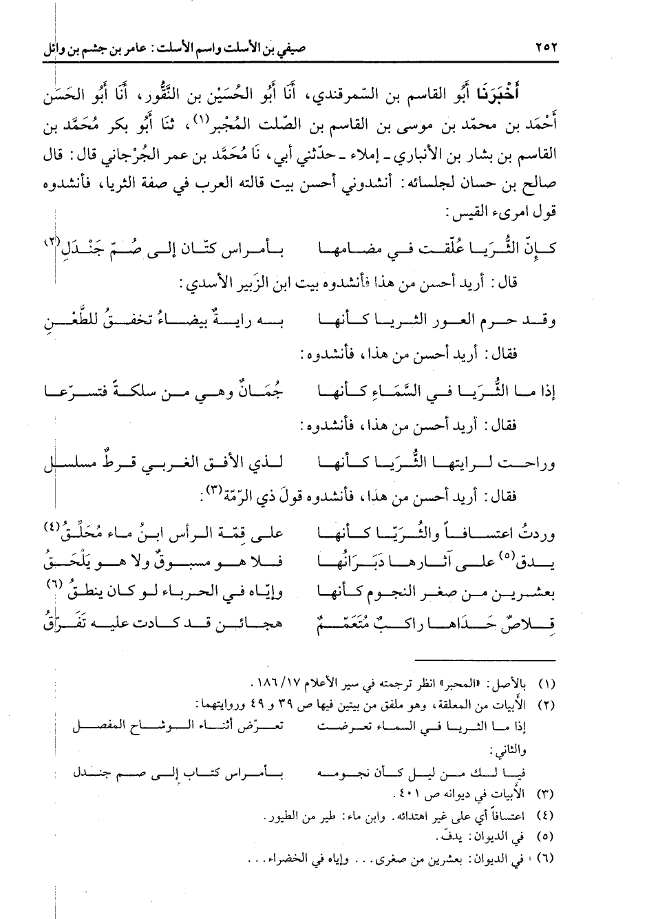 أخبرنا أبو القاسم بن السمرقندي أنا أبو الحسين بن النقور أنا أبو الحسن أحمد بن محمد بن موسى بن القاسم بن الصلت المجبر (1) ثنا أبو بكر محمد بن القاسم بن بشار بن الأنباري إملاء حدثني أبي نا محمد بن عمر الجرجاني قال قال صالح بن حسان لجلسائه أنشدوني أحسن بيت قالته العرب في صفة الثريا فأنشدوه قول امرئ القيس * كإن الثريا علقت في مضامها * بأمراس كتان إلى صم جندل (2) * قال أريد أحسن من هذا فأنشدوه بيت ابن الزبير الأسدي * وقد حرم العور الثريا كأنها * به رأية بيضاء تخفق للطعن * فقال أريد أحسن من هذا فأنشدوه * إذا ما الثريا في السماء كأنها * جمان وهي من سلكة فتسرعا * فقال أريد أحسن من هذا فأنشدوه * وراحت لرايتها الثريا كأنها * لذي الأفق الغربي قرط مسلسل * فقال أريد أحسن من هذا فأنشدوه قول ذي الرمة (3) : * وردت اعتسافا والثريا كأنها * على قمة الرأس ابن ماء محلق (4) يدق (5) على آثارها دبرانها * فلا هو مسبوق ولا هو يلحق بعشرين من صغر النجوم كأنها * وإياه في الحرباء لو كان ينطق (6) قلاص حداها راكب متعمم * هجائن قد كادت عليه تفرق *
