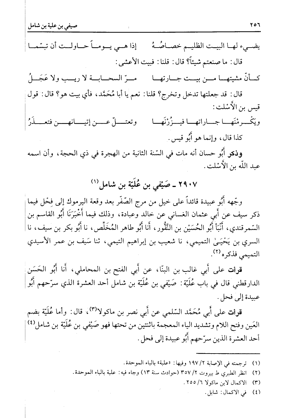 قرأت على أبي غالب بن البنا عن أبي الفتح بن المحاملي أنا أبو الحسن الدارقطني قال في باب علية صيفي بن علية بن شامل أحد العشرة الذي سرحهم أبو عبيدة إلى فحل قرأت على أبي محمد السلمي عن أبي نصر بن ماكولا (3) قال وأما علية بضم العين وفتح اللام وتشديد الياء المعجمة باثنتين من تحتها فهو صيفي بن علية بن شامل (4) أحد العشرة الذين سرحهم أبو عبيدة إلى فحل