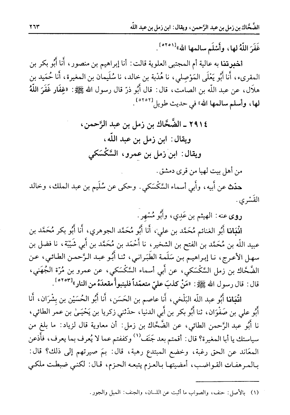 2914 - الضحاك بن زمل بن عبد الرحمن ويقال ابن زمل بن عبد الله ويقال ابن زمل بن عمرو السكسكي من أهل بيت لهيا من قرى دمشق حدث عن أبيه وأبي أسماء السكسكي وحكى عن سليم بن عبد الملك وخالد القسري روى عه الهيثم بن عدي وأبو مسهر أنبأنا أبو الغنائم محمد بن علي أنا أبو محمد الجوهري أنا أبو بكر محمد بن عبيد الله بن محمد بن الفتح بن الشخير نا أحمد بن محمد بن أبي شيبة نا فضل بن سهل الأعرج نا إبراهيم بن سلمة الطبراني ثنا أبو عبد الرحمن الطائي عن الضحاك بن زمل السكسكي عن أبي أسماء السكسكي عن عمرو بن مرة الجهني قال قال رسول الله (صلى الله عليه وسلم) من كذب علي متعمدا فليتبوأ مقعده من النار أنبأنا أبو عبد الله البلخي أنا عاصم بن الحسن أنا أبو الحسين بن بشران أنا أبو علي بن صفوان ثنا أبو بكر بن أبي الدنيا حدثني زكريا بن يحيى بن عمر الطائي نا أبو عبد الرحمن الطائي عن الضحاك بن زمل أن معاوية قال لزياد ما بلغ من سياستك يا أبا المغيرة قال أقمتم بعد جنف (1) وكففتم عما لا يعرف بما يعرف فأذعن المعاند عن الحق رغبة وخضع المبتدع رهبة قال بم صيرتهم إلى ذلك قال بالمرهفات القواضب أمضيتها بالعزم يتبعه الحزم قال لكني ضبطت ملكي
