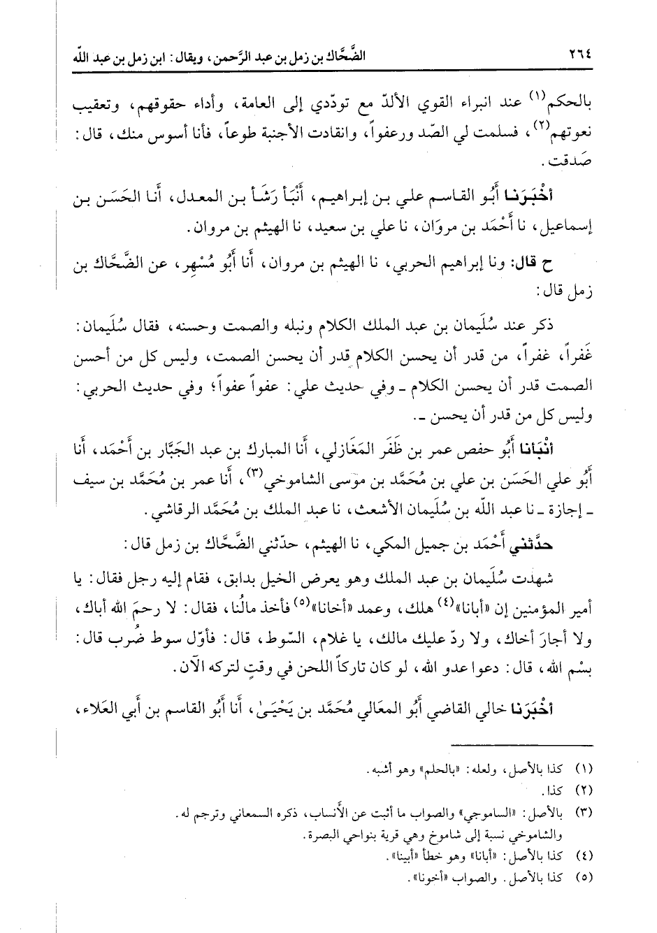 بالحكم (1) عن انبراء القوي الألد مع توددي إلى العامة وأداء حقوقهم وتعقيب نعوتهم (2) فسلمت لي الصد ورعفوا وانقادت الأجنبة طوعا فأنا أسوس منك قال صدقت أخبرنا أبو القاسم علي بن إبراهيم أنبأ رشأ بن المعدل أنا الحسن بن إسماعيل نا أحمد بن مروان نا علي بن سعيد نا الهيثم بن مروان ح قال ونا إبراهيم الحربي نا الهيثم بن مروان أنا أبو مسهر عن الضحاك بن زمل قال ذكر عند سليمان بن عبد الملك الكلام ونبله والصمت وحسنه فقال سليمان غفرا غفرا من قدر أن يحسن الكلام قدر أن يحسن الصمت وليس كل من أحسن الصمت قدر أن يحسن الكلام وفي حديث علي عفوا عفوا وفي حديث الحربي وليس كل من قدر أن يحسن أنبأنا أبو حفص عمر بن ظفر المغازلي أنا المبارك بن عبد الجبار بن أحمد أنا أبو علي الحسن بن علي بن محمد بن موسى الشاموخي (3) أنا عمر بن محمد بن سيف إجازة نا عبد الله بن سليمان الأشعث نا عبد الملك بن محمد الرقاشي حدثني أحمد بن جميل المكي نا الهيثم حدثني الضحاك بن زمل قال شهدت سليمان بن عبد الملك وهو يعرض الخيل بدابق فقام إليه رجل فقال يا أمير المؤمنين إن أبانا (4) هلك وعمد أخانا (5) فأخذ مالنا فقال لا رحم الله أباك ولا أجار أخاك ولا رد عليك مالك يا غلام السوط قال فأول سوط ضرب قال بسم الله قال دعوا عدو الله لو كان تاركا اللحن في وقت لتركه الآن