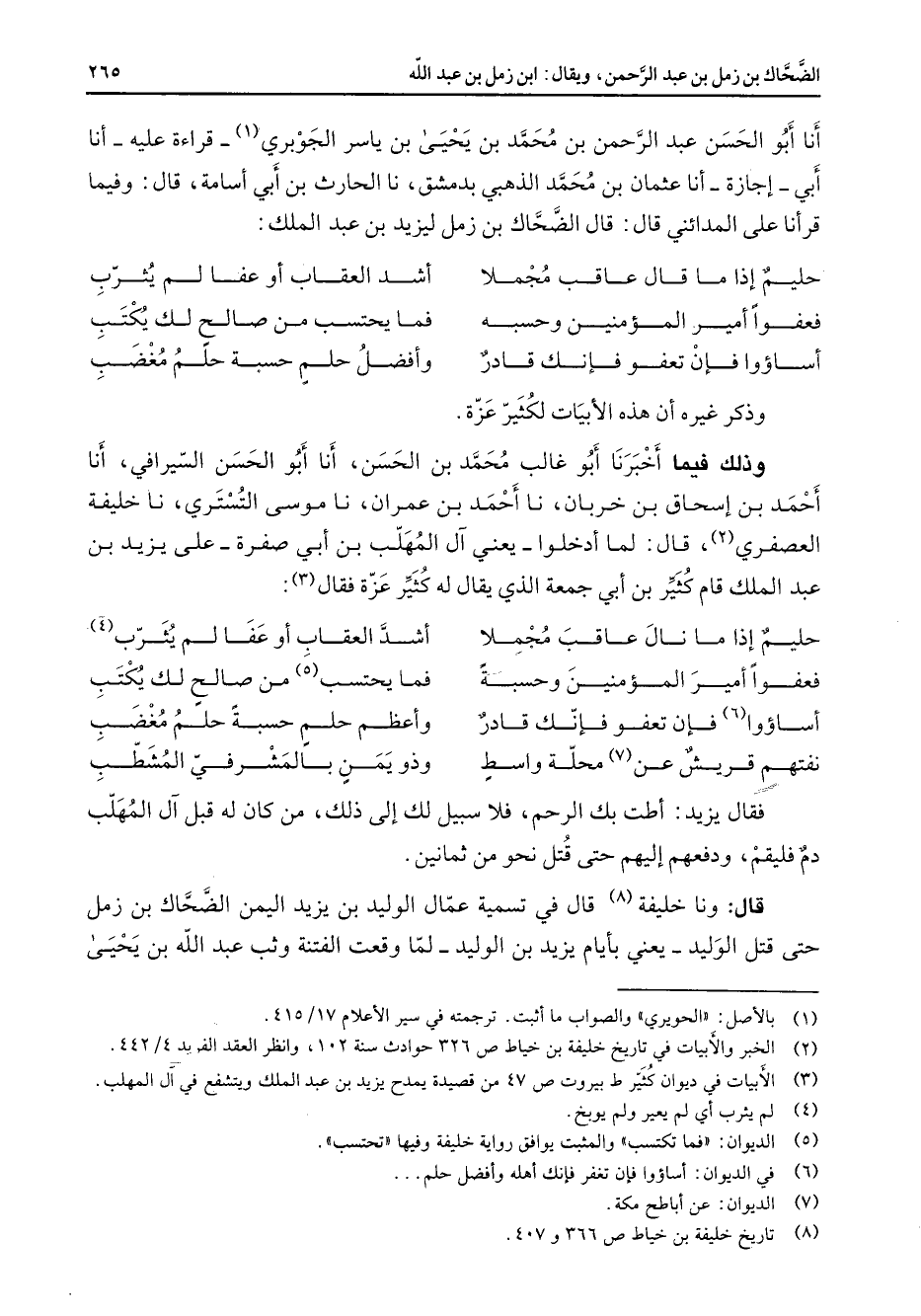 أنا أبو الحسن عبد الرحمن بن محمد بن يحيى بن ياسر الجويري (1) قراءة عليه أنا أبي إجازة أنا عثمان بن محمد الذهبي بدمشق نا الحارث بن أبي أسامة قال وفيما قرأنا على المدائني قال قال الضحاك بن زمل ليزيد بن عبد الملك * حليم إذا ما قال عاقب مجملا * أشد العقاب أو عفا لم يثرب فعفوا أمير المؤمنين وحسبه * فما يحتسب من صالح لك يكتب أساؤوا فإن تعفوا فإنك قادر * وأفضل حلم حسبة حلم مغضب * وذكر غيره أن هذه الأبيات لكثير عزة وذلك فيما أخبرنا أبو غالب محمد بن الحسن أنا أبو الحسن السيرافي أنا أحمد بن إسحاق بن خربان نا أحمد بن عمران نا موسى التستري نا خليفة العصفري (2) قال لما أدخلوا يعني آل المهلب بن أبي صفرة على يزيد بن عبد الملك قام كثير بن أبي جمعة الذي يقال له كثير عزة فقال (3) * حليم إذا ما نال عاقب مجملا * أشد العقاب أو عفا لم يثرب (4) * * فعفوا أمير المؤمنين وحسبة * فما يحتسب (5) من صالح لك يكتب أساؤوا (6) فإن تعفوا فإنك قادر * وأعظم حلم حسبة حلم مغضب نفتهم قريش عن (7) محلة واسط * وذو يمن بالمشرفي المشطب * فقال يزيد أطت بك الرحم فلا سبيل لك إلى ذلك من كان له قبل آل المهلب دم فليقم ودفعهم إليهم حتى قتل نحو من ثمانين قال ونا خليفة (8) قال في تسمية عمال الوليد بن يزيد اليمن الضحاك بن زمل حتى قتل الوليد يعني بأيام يزيد بن الوليد لما وقعت الفتنة وثب عبد الله بن يحيى