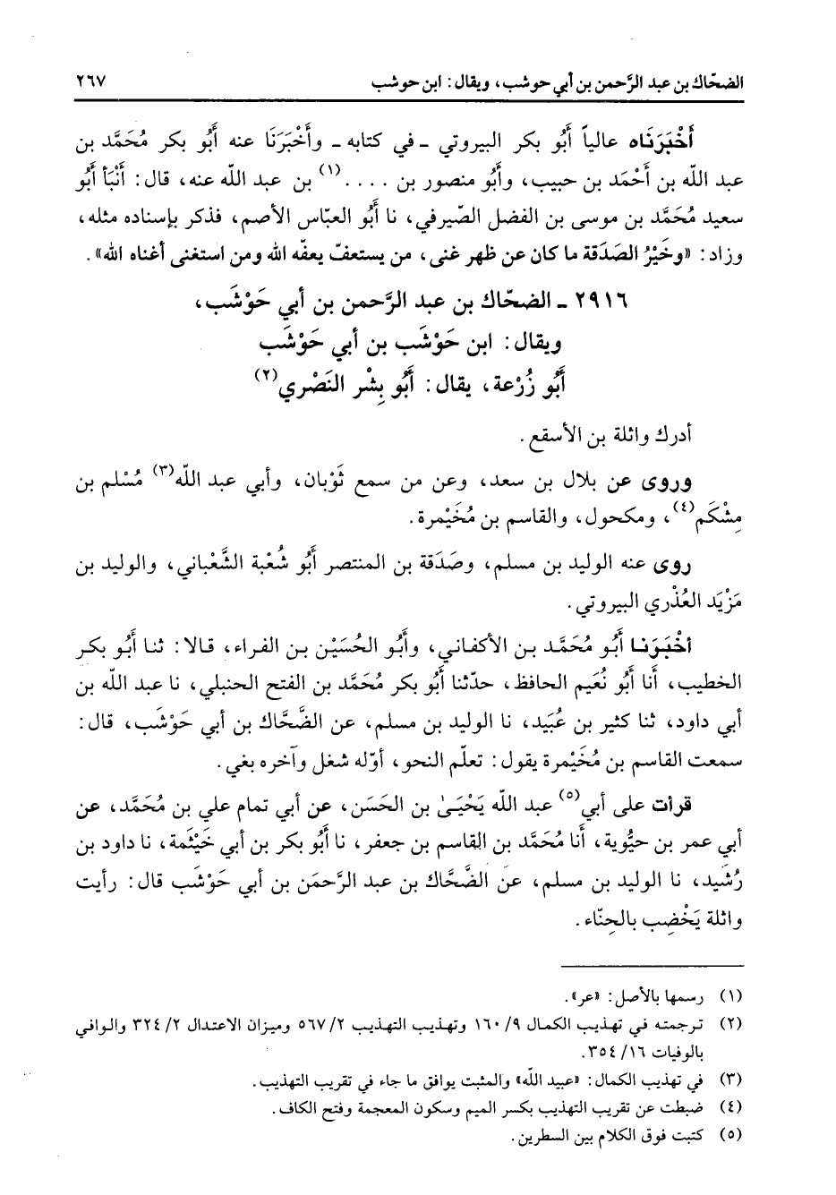 2916 - الضحاك بن عبد الرحمن بن أبي حوشب ويقال ابن حوشب بن أبي حوشب أبو زرعة يقال أبو بشر النصري (2) أدرك واثلة بن الأسقع وروى عن بلال بن سعد وعن من سمع ثوبان وأبي عبد الله (3) مسلم بن مشكم (4) ومكحول والقاسم بن مخيمرة روى عنه الوليد بن مسلم وصدقة بن المنتصر أبو شعبة الشعباني والوليد بن مزيد العذري البيروتي أخبرنا أبو محمد بن الأكفاني وأبو الحسين بن الفراء قالا ثنا أبو بكر الخطيب أنا أبو نعيم الحافظ حدثنا أبو بكر محمد بن الفتح الحنبلي نا عبد الله بن أبي داود ثنا كثير بن عبيد نا الوليد بن مسلم عن الضحاك بن أبي حوشب قال سمعت القاسم بن مخيمرة يقول تعلم النحو أوله شغل وآخره بغي قرأت على أبي (5) عبد الله يحيى بن الحسن عن أبي تمام علي بن محمد عن أبي عمر بن حيوية أنا محمد بن القاسم بن جعفر نا أبو بكر بن أبي خيثمة نا داود بن رشيد نا الوليد بن مسلم عن الضحاك بن عبد الرحمن بن أبي حوشب قال رأيت واثلة يخضب بالحناء