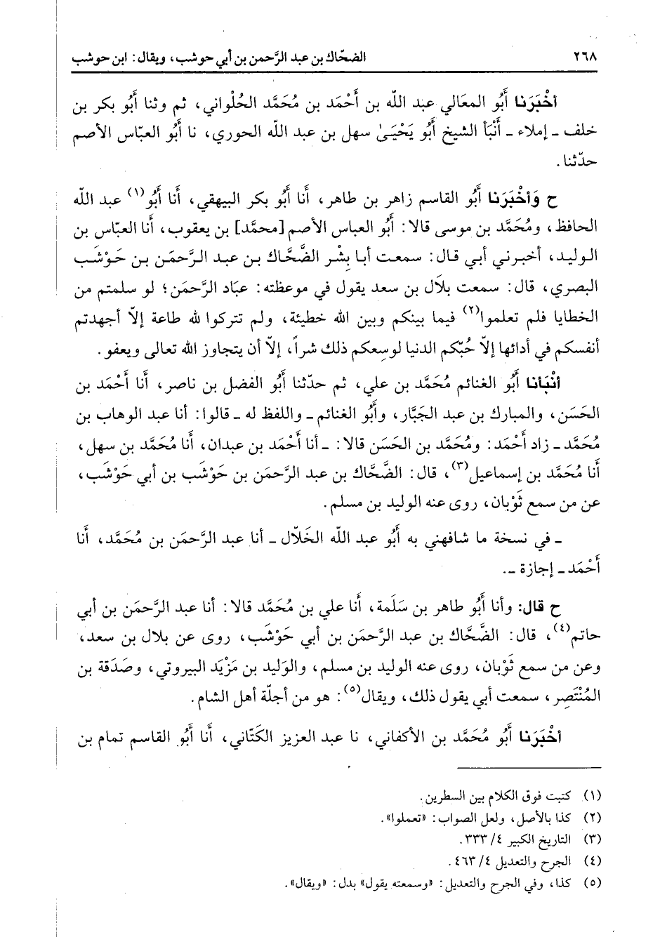 أخبرنا أبو المعالي عبد الله بن أحمد بن محمد الحلواني ثم وثنا أبو بكر بن خلف إملاء أنبأ الشيخ أبو يحيى سهل بن عبد الله الحوري نا أبو العباس الأصم حدثنا ح وأخبرنا أبو القاسم زاهر بن طاهر أنا أبو بكر البيهقي أنا أبو (1) عبد الله الحافظ ومحمد بن موسى قالا أبو العباس الأصم محمد بن يعقوب أنا العباس بن الوليد أخبرني أبي قال سمعت أبا بشر الضحاك بن عبد الرحمن بن حوشب البصري قال سمعت بلال بن سعد يقول في موعظته عباد الرحمن لو سلمتم من الخطايا فلم تعلموا (2) فيما بينكم وبين الله خطيئة ولم تتركوا لله طاعة إلا أجهدتم أنفسكم في أدائها إلا حبكم الدنيا لوسعكم ذلك شرا إلا أن يتجاوز الله تعالى ويعفو أنبأنا أبو الغنائم محمد بن علي ثم حدثنا أبو الفضل بن ناصر أنا أحمد بن الحسن والمبارك بن عبد الجبار وأبو الغنائم واللفظ له قالوا أبا عبد الوهاب بن محمد زاد أحمد ومحمد بن الحسن قالا أنا أحمد بن عبدان أنا محمد بن سهل أنا محمد بن إسماعيل (3) قال الضحاك بن عبد الرحمن بن حوشب بن أبي حوشب عن من سمع ثوبان روى عنه الوليد بن مسلم في نسخة ما شافهني به أبو عبد الله الخلال أنا عبد الرحمن بن محمد أنا أحمد إجازة ح قال وأنا أبو طاهر بن سلمة أنا علي بن محمد قالا أنا عبد الرحمن بن أبي حاتم (4) قال الضحاك بن عبد الرحمن بن أبي حوشب روى عن بلال بن سعد وعن من سمع ثوبان روى عنه الوليد بن مسلم والوليد بن مزيد البيروتي وصدقة بن المنتصر سمعت أبي يقول ذلك ويقال (5) هو من أجلة أهل الشام أخبرنا أبو محمد بن الأكفاني نا عبد العزيز الكتاني أنا أبو القاسم تمام بن