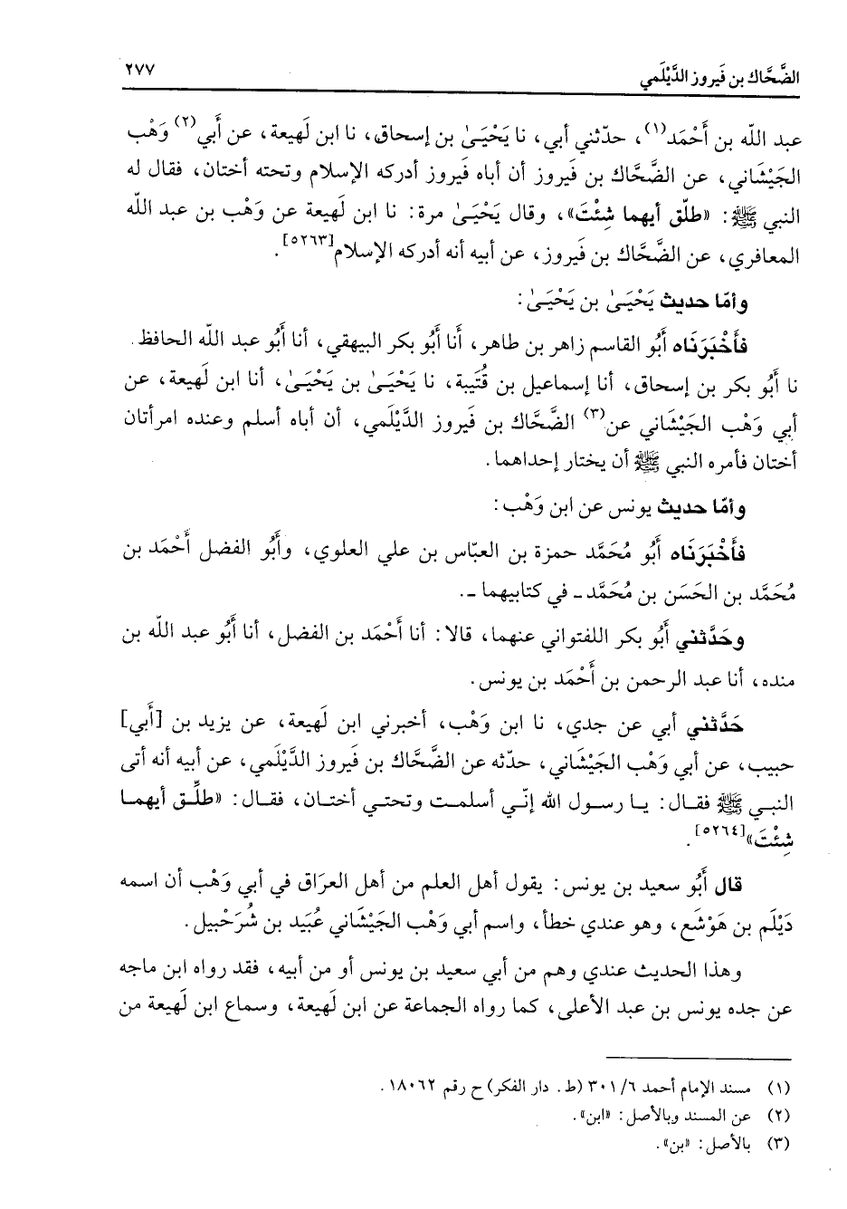 عبد الله بن أحمد حدثني أبي نا يحيى بن إسحاق نا ابن لهيعة عن أبي (2) وهب الجيشاني عن الضحاك بن فيروز أن أباه فيروز أدركه الإسلام وتحته أختان فقال له النبي (صلى الله عليه وسلم) طلق أيهما شئت وقال يحيى مرة نا ابن لهيعة عن وهب بن عبد الله المعافري عن الضحاك بن فيروز عن أبيه أنه أدركه الإسلام وأما حديث يحيى بن يحيى فأخبرناه أبو القاسم زاهر بن طاهر أنا أبو بكر البيهقي أنا أبو عبد الله الحافظ نا أبو بكر بن إسحاق أنا إسماعيل بن قتيبة نا يحيى بن يحيى أنا ابن لهيعة عن أبي وهب الجيشاني عن (3) الضحاك بن فيروز الديلمي أن أباه أسلم وعنده امرأتان أختان فأمره النبي (صلى الله عليه وسلم) أن يختار إحداهما وأما حديث يونس عن ابن وهب فأخبرناه أبو محمد حمزة بن العباس بن علي العلوي وأبو الفضل أحمد بن محمد بن الحسن بن محمد في كتابيهما وحدثني أبو بكر اللفتواني عنهما قالا أنا أحمد بن الفضل أنا أبو عبد الله بن منده أنا عبد الرحمن بن أحمد بن يونس حدثني أبي عن جدي نا ابن وهب أخبرني ابن لهيعة عن يزيد بن أبي حبيب عن أبي وهب الجيشاني حدثه عن الضحاك بن فيروز الديلمي عن أبيه أنه أتى النبي (صلى الله عليه وسلم) فقال يا رسول الله إني أسلمت وتحتي أختان فقال النبي طلق أيهما شئت قال أبو سعيد بن يونس يقول أهل العلم من أهل العراق في أبي وهب أن اسمه ديلم بن هوشع وهو عندي خطأ واسم أبي وهب الجيشاني عبيد بن شرحبيل وهذا الحديث عندي وهم من أبي سعيد بن يونس أو من أبيه فقد رواه ابن ماجه عن جده يونس بن عبد الأعلى كما رواه الجماعة عن ابن لهيعة وسماع ابن لهيعة من