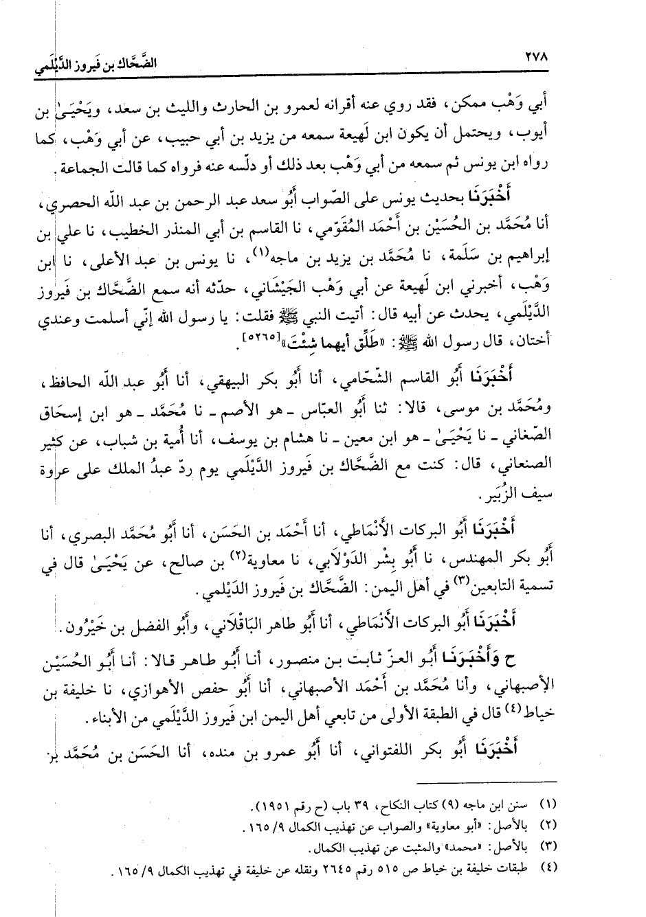 أبي وهب ممكن فقد روى عنه أقرانه لعمرو بن الحارث والليث بن سعد ويحيى بن أيوب ويحتمل أن يكون ابن لهيعة سمعه من يزيد بن أبي حبيب عن أبي وهب كما رواه ابن يونس ثم سمعه من أبي وهب بعد ذلك أو دلسه عنه فرواه كما قالت الجماعة أخبرنا بحديث يونس على الصواب أبو سعد عبد الرحمن بن عبد الله الحصري أنا محمد بن الحسين بن أحمد المقومي نا القاسم بن أبي المنذر الخطيب نا علي بن إبراهيم بن سلمة نا محمد بن يزيد بن ماجه (1) نا يونس بن عبد الأعلى نا ابن وهب أخبرني ابن لهيعة عن أبي وهب الجيشاني حدثه أنه سمع الضحاك بن فيروز الديلمي يحدث عن أبيه قال أتيت النبي (صلى الله عليه وسلم) فقلت يا رسول الله إني أسلمت وعندي أختان قال رسول الله (صلى الله عليه وسلم) له طلق أيهما شئت أخبرنا أبو القاسم الشحامي أنا أبو بكر البيهقي أنا أبو عبد الله الحافظ ومحمد بن موسى قالا ثنا أبو العباس هو الأصم نا محمد هو ابن إسحاق الصغاني نا يحيى هو ابن معين نا هشام بن يوسف أنا أمية بن شباب عن كثير الصنعاني قال كنت مع الضحاك بن فيروز الديلمي يوم رد عبد الملك على عروة سيف الزيبر أخبرنا أبو البركات الأنماطي أنا أحمد بن الحسن أنا أبو محمد البصري أنا أبو بكر المهندس نا أبو بشر الدولابي نا معاوية بن صالح عن يحيى قال في تسمية التابعين (3) في أهل اليمن الضحاك بن فيروز الديلمي أخبرنا أبو البركات الأنماطي أنا أبو طاهر الباقلاني وأبو الفضل بن خيرون ح وأخبرنا أبو العز ثابت بن منصور أنا أبو طاهر قالا أنا أبو الحسين الأصبهاني وأنا محمد بن أحمد الأصبهاني أنا أبو حفص الأهوازي نا خليفة بن خياط (4) قال في الطبقة الأولى من تابعي أهل اليمن ابن فيروز الديلمي من الأبناء أخبرنا أبو بكر اللفتواني أنا أبو عمرو بن منده أنا الحسن بن محمد بن