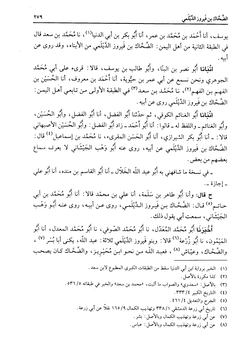 يوسف أنا أحمد بن محمد بن عمر أنا أبو بكر بن أبي الدنيا (1) نا محمد بن سعد قال في الطبقة الثانية من أهل اليمن الضحاك بن فيروز الديلمي من الأبناء وقد روى عن أبيه أنبأنا أبو نصر بن البنا وأبو طالب بن يوسف قالا قرئ على أبي محمد الجوهري ونحن نسمع عن أبي عمر بن حيوية أنا أحمد بن معروف أنا الحسين بن الفهم بن الفهم (2) نا محمد بن سعد (3) في الطبقة الأولى من تابعي أهل اليمن الضحاك بن فيروز الديلمي روى عن أبيه أنبأنا أبو الغنائم الكوفي ثم حدثنا أبو الفضل أنا أبو الفضل وأبو الحسين وأبو الغنائم واللفظ له قالوا أنا أبو أحمد زاد أبو الفضل وأبو الحسين الأصبهاني قالا أنا أبو بكر الشيرازي أنا أبو الحسن المقرئ نا محمد بن إسماعيل (4) قال: الضحاك بن فيروز الديلمي عن أبيه روى عنه أبو وهب الجيشاني لا يعرف سماع بعضهم من بعض في نسخة ما شافهني به أبو عبد الله الخلال أنا أبو القاسم بن منده أنا أبو علي إجازة ح قال وأنا أبو طاهر بن سلمة أنا علي بن محمد قالا أنا أبو محمد بن أبي حاتم (5) قال الضحاك بن فيروز الديلمي روى عن أبيه روى عنه أبو وهب الجيشاني سمعت أبي يقول ذلك أخبرنا أبو محمد المعدل نا أبو محمد الصوفي نا أبو محمد المعدل أنا أبو الميمون نا أبو زرعة (6) قالا وبنو فيروز الديلمي ثلاثة عبد الله يكنى أبا بسر (7) والضحاك وعياش (8) فعبد الله من نحو ابن محيريز والضحاك كان يصحب