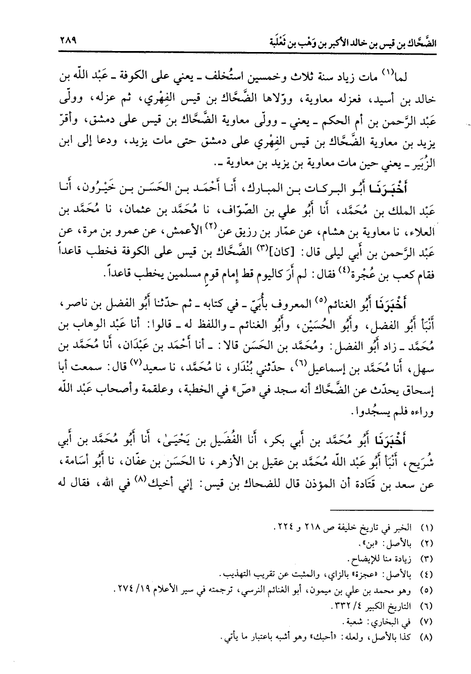 لما (1) مات زياد سنة ثلاث وخمسين استخلف يعني على الكوفة عبد الله بن خالد بن أسيد فعزله معاوية وولاها الضحاك بن قيس الفهري ثم عزله وولى عبد الرحمن بن أم الحكم يعني وولى معاوية الضحاك بن قيس على دمشق وأقر يزيد بن معاوية الضحاك بن قيس الفهري على دمشق حتى مات يزيد ودعا إلى ابن الزبير يعني حتى مات معاوية بن يزيد بن معاوية أخبرنا أبو البركات بن المبارك أنا أحمد بن الحسن بن خيرون أنا عبد الملك بن محمد أنا أبو علي بن الصواف نا محمد بن عثمان نا محمد بن العلاء نا معاوية بن هشام عن عمار بن رزيق عن (2) الأعمش عن عمرو بن مرة عن عبد الرحمن بن أبي ليلى قال كان (3) الضحاك بن قيس على الكوفة فخطب قاعدا فقام كعب بن عجرة فقا لم أر كاليوم قط إمام قوم مسلمين يخطب قاعدا أخبرنا أبو الغنائم (5) المعروف بأبي في كتابه ثم حدثنا أبو الفضل بن ناصر أنبأ أبو الفضل وأبو الحسين وأبو الغنائم واللفظ له قالوا أنا عبد الوهاب بن محمد زاد أبو الفضل ومحمد بن الحسن قالا أنا أحمد بن عبدان أنا محمد بن سهل أنا محمد بن إسماعيل (6) حدثني بندار نا محمد نا سعيد (7) قال سمعت أبا إسحاق يحدث عن الضحاك أنه سجد في ص في الخطبة وعلمقة وأصحاب عبد الله وراءه فلم يسجدوا أخبرنا أبو محمد بن أبي بكر أنا الفضيل بن يحيى أنا أبو محمد بن أبي شريح أنبأ أبو عبد الله محمد بن عقيل بن الأزهر نا الحسن بن عفان نا أبو أسامة عن سعد بن قتادة أن المؤذن قال للضحاك بن قيس إني أخيك (8) في الله فقال له