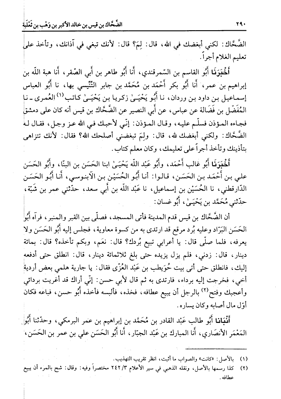 الضحاك لكني أبغضك في الله قال لم قال لأنك تبغي في آذانك وتأخذ على تعليم الغلام أجرا أخبرنا أبو القاسم بن السمرقندي أنا أبو طاهر بن أبي الصقر أنا هبة الله بن إبراهيم بن عمر أنا أبو بكر أحمد بن محمد بن جابر التنيسي بها نا أبو العباس إسماعيل بن داود بن وردان نا أبو يحيى زكريا بن يحيى كاتب (1) العمري نا المفضل بن فضالة عن عباس عن أبي النصير عن الضحاك بن قيس أنه كان على دمشق فجاءه المؤذن فسلم عليه وقال المؤذن إني لأحبك في الله عز وجل فقال له الضحاك ولكني أبغضك لله قال ولم تبغضني أصلحك الله فقال لأنك تتزاهى بتأذينك وتأخذ أجرا على تعليمك وكان معلم كتاب أخبرنا أبو غالب أحمد وأبو عبد الله يحيى ابنا الحسن بن البنا أبو الحسن علي بن أحمد بن الحسن قالوا أنا أبو الحسين بن الآبنوسي أنا أبو الحسن الدارقطني نا الحسين بن إسماعيل نا عبد الله بن أبي سعد حدثني عمر بن شبة حدثني محمد بن يحيى أبو غسان أن الضحاك بن قيس قدم المدينة فأتى المسجد فصلى بين القبر والمنبر فرآه أبو الحسن البراد وعليه برد مرقع قد ارتدى به من كسوة معاوية فجلس إليه أبو الحسن ولا يعرفه فلما صلى قال يا أعرابي تبيع بردك قال نعم وبكم تأخذه قال بمائة دينار قال زدني فلم يزل يزيده حتى بلغ ثلاثمائة دينار قال انطلق حتى أدفعه إليك فانطلق حتى أتى بيت حويطب بن عبد العزى فقال يا جارية هلمي بعض أردية أخي فخرجت إليه برداء فارتدى به ثم قال لأبي حسن إني أراك قد أغريت بردائي وأعجبك وفتح (2) بالرجل أن يبيع عطافه فخذه فألبسه فأخذه أبو حسن فباعه فكان أول مال أصابه وكان يساره أنبأنا أبو طالب عبد القادر بن محمد بن إبراهيم بن عمر البرمكي وحدثنا أبو المعمر الأنصاري أنا المبارك بن عبد الجبار أنا أبو الحسن علي بن عمر بن الحسن