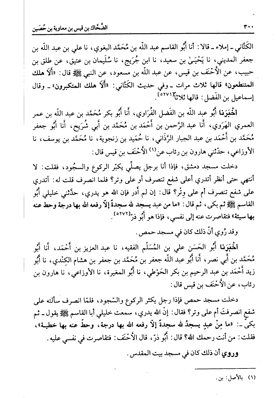 الكتاني إملاء قالا أنا أبو القاسم عبد الله بن محمد البغوي نا علي بن عبد الله بن جعفر المديني نا يحيى بن سعيد نا ابن جريج نا سليمان بن عتيق عن طلق بن حبيب عن الأحنف بن قيس عن عبد الله بن مسعود عن النبي (صلى الله عليه وسلم) قال ألا هلك المتنطعون قالها ثلاث مرات وفي حديث الكتاني ألا هلك المتكبرون وقال إسماعيل بن الفضل قالها ثلاثا أخبرنا أبو عبد الله بن الفضل الفراوي أنا أبو بكر محمد بن عبد الله بن عمر العمري الهروي أنا عبد الرحمن بن أحمد بن محمد بن أبي شريح أنا أبو جعفر محمد بن أحمد بن عبد الجبار الرذاني نا حميد بن زنجوية نا محمد بن يوسف نا الأوزاعي حدثني هارون بن رئاب عن (1) الأحنف بن قيس قال دخلت مسجد دمشق فإذا أنا برجل يصلي يكبر الركوع والسجود فقلت لا أنتهى حتى أنظر أتدري أعلى شفع تنصرف أو على وتر فلما انصرف قلت له أتدري على شفع تنصرف أم على وتر قال إن لم أدر فإن الله هو يدري حدثني خليلي أبو القاسم (صلى الله عليه وسلم) ثم بكى ثم قال ما من عبد يسجد لله سجدة إلا رفعه الله بها درجة وحط عنه بها سيئة فتقاصرت عنه إلى نفسي فإذا هو أبو ذر وقد روي أن ذلك كان في مسجد حمص أخبرنا أبو الحسن علي بن المسلم الفقيه نا عبد العزيز بن أحمد أنا أبو محمد بن أبي نصر أنا أبو عبد الله جعفر بن محمد بن جعفر بن هشام الكندي نا أبو زيد أحمد بن عبد الرحيم بن بكر الحوطي نا أبو المغيرة نا الأوزاعي نا هارون بن رئاب عن الأحنف بن قيس قال