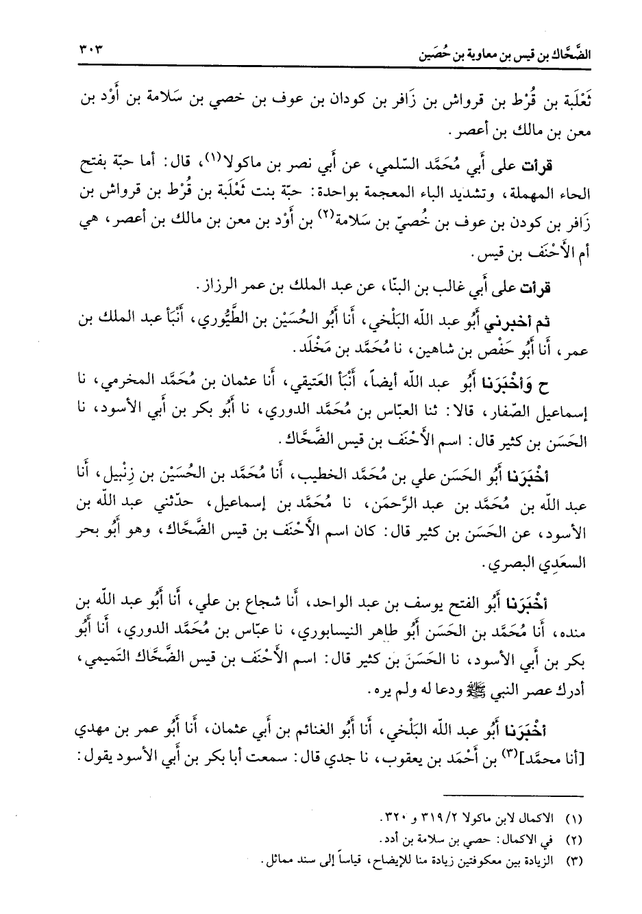 ثعلبة بن قرط بن قرواش بن زافر بن كودان بن عوف بن خصي بن سلامة بن أود بن معن بن مالك بن أعصر قرأت على أبي محمد السلمي عن أبي نصر بن ماكولا (1) قال أما حبة بفتح الحاء المهملة وتشديد الباء المعجمة بواحدة حبة بنت ثعلبة بن قرط بن قرواش بن زافر بن كودن بن عوف بن خصي بن سلامة بن أود بن معن بن مالك بن أعصر هي أم الأحنف بن قيس قرأت على أبي غالب بن البنا عن عبد الملك بن عمر الرزاز ثم أخبرني أبو عبد الله البلخي أنا أبو الحسين بن الطيوري أنبأ عبد الملك بن عمر أنا أبو حفص بن شاهين نا محمد بن مخلد ح وأخبرنا أبو عبد الله أيضا أنبأ العتيقي أنا عثمان بن محمد المخرمي نا إسماعيل الصفار قالا ثنا العباس بن محمد الدوري نا أبو بكر بن أبي الأسود نا الحسن بن كثير قال اسم الأحنف بن قيس الضحاك أخبرنا أبو الحسن علي بن محمد الخطيب أنا محمد بن الحسين بن زنبيل أنا عبد الله بن محمد بن عبد الرحمن نا محمد بن إسماعيل حدثني عبد الله بن الأسود عن الحسن بن كثير قال كان اسم الأحنف بن قيس الضحاك وهو أبو بحر السعدي البصري أخبرنا أبو الفتح يوسف بن عبد الواحد أنا شجاع بن علي أنا أبو عبد الله بن منده أنا محمد بن الحسن أبو طاهر النيسابوري نا عباس بن محمد الدوري أنا أبو بكر بن أبي الأسود نا الحسن بن كثير قال اسم الأحنف بن قيس الضحاك التميمي أدرك عصر النبي (صلى الله عليه وسلم) ودعا له ولم يره أخبرنا أبو عبد الله البلخي أنا أبو الغنائم بن أبي عثمان أنا أبو عمر بن مهدي أنا محمد (3) بن أحمد بن يعقوب نا جدي قال سمعت أبا بكر بن أبي الأسود يقول