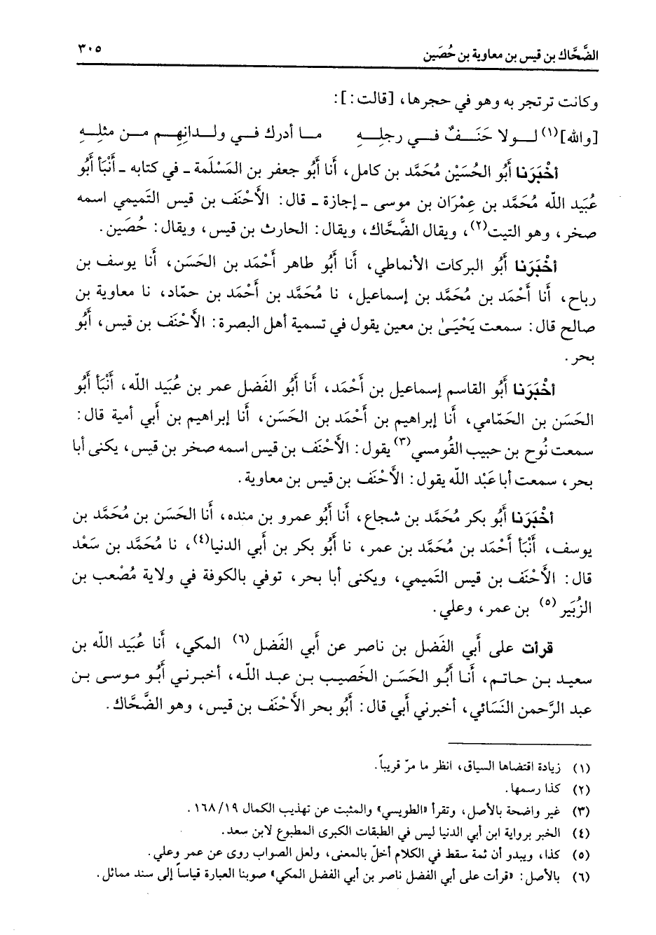 وكانت ترتجر به وهو في حجرها قالت: * والله (1) لولا حنف في رجله * ما أدرك في ولدانهم من مثله * أخبرنا أبو الحسين محمد بن كامل أنا أبو جعفر بن المسلمة في كتابه أنبأ أبو عبيد الله محمد بن عمران بن موسى إجازة قال الأحنف بن قيس التميمي اسمه صخر وهو التيت (2) ويقال الضحاك ويقال الحارث بن قيس ويقال حصين أخبرنا أبو البركات الأنماطي أنا أبو طاهر أحمد بن الحسن أنا يوسف بن رباح أنا أحمد بن محمد بن إسماعيل نا محمد بن أحمد بن حماد نا معاوية بن صالح قال سمعت يحيى بن معين يقول في تسمية أهل البصرة الأحنف بن قيس أبو بحر أخبرنا أبو القاسم إسماعيل بن أحمد أنا أبو الفضل عمر بن عبيد الله أنبأ أبو الحسن بن الحمامي أنا إبراهيم بن أحمد بن الحسن أنا إبراهيم بن أبي أمية قال سمعت نوح بن حبيب القومسي (3) يقول الأحنف بن قيس اسمه صخر بن قيس يكنى أبا بحر سمعت أبا عبد الله يقول الأحنف بن قيس بن معاوية أخبرنا أبو بكر محمد بن شجاع أنا أبو عمرو بن منده أنا الحسن بن محمد بن يوسف أنبأ أحمد بن محمد بن عمر نا أبو بكر بن أبي الدنيا (4) نا محمد بن سعد قال الأحنف بن قيس التميمي ويكنى أبا بحر توفي بالكوفة في ولاية مصعب بن الزبير (5) بن عمر وعلي قرأت على أبي الفضل بن ناصر عن أبي الفضل (6) المكي أنا عبيد الله بن سعيد بن حاتم أنا أبو الحسن الخصيب بن عبد الله أخبرني أبو موسى بن عبد الرحمن النسائي أخبرني أبي قال أبو بحر الأحنف بن قيس وهو الضحاك