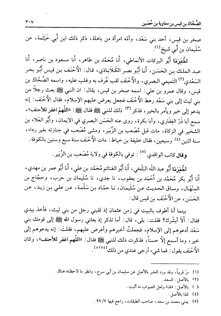 أخبرنا أبو البركات الأنماطي أنا محمد بن طاهر أنا مسعود بن ناصر أنا عبد الملك بن الحسن أنا أبو نصر الكلاباذي قال الأحنف بن قيس أبو بحر السعدي (2) التميمي البصري والأحنف لقب عرف به وغلب عليه واسمه الضحاك بن قيس وقال عمرو بن علي اسمه صخر بن قيس يقال أن النبي (صلى الله عليه وسلم) بعث رجلا من بني ليث إلى بني سعد رهط الأحنف فجعل يعرض عليهم الإسلام فقال الأحنف إنه يدعو إلى خير ويأمر بالخير فذكر (3) ذلك للنبي (صلى الله عليه وسلم) فقال (صلى الله عليه وسلم) اللهم اغفر للأحنف سمع أبا ذر الغفاري وأبا بكرة روى عنه الحسن البصري في الايمان وأبو العلاء بن الشخير في الزكاة مات قبل مصعب بن الزبير ومشى مصعب في جنازته بغير رداء سنة اثنين (4) وسبعين فقال خليفة بن خياط مات الأحنف سنة سبع وستين بالكوفة وقال كاتب الواقدي (5) : توفي بالكوفة في ولاية مصعب بن الزبير أخبرنا أبو عبد الله البلخي أنا أبو الغنائم محمد بن علي أنا أبو عمر بن مهدي أنا أبو بكر محمد بن أحمد بن يعقوب نا جدي نا سليمان بن حرب وحجاج بن المنهال وساق الحديث عن سليمان نا حماد بن سلمة عن علي بن زيد عن الحسن عن الأحنف بن قيس قال بينما أنا أطوف بالبيت في زمن عثمان إذ لقيني رجل من بني ليث فأخذ بيدي فقال ألا أبشرك فقلت بلى قال أما تذكر إذ بعثني رسول الله (صلى الله عليه وسلم) إلى قومك بني سعد أدعوهم إلى الإسلام فجعلت أخبرهم وأعرض عليهم فقلت إنه يدعوهم إلى خير وما أسمع إلا حسنا فذكرت ذلك للنبي (صلى الله عليه وسلم) فقال اللهم اغفر للأحنف وكان الأحنف يقول فما شئ أرجى عندي من ذلك