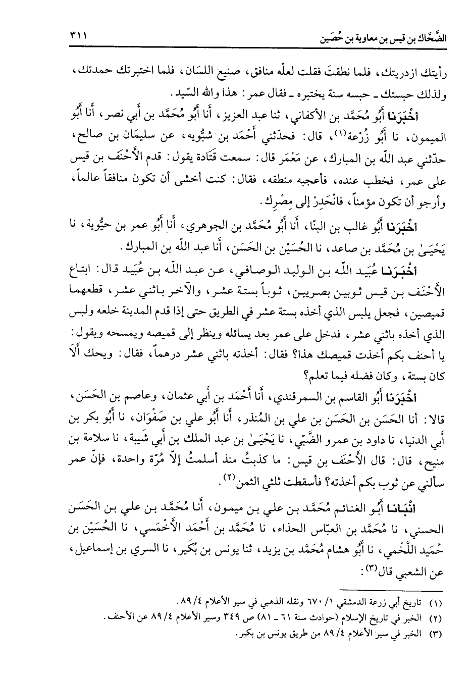 أنبأنا أبو الغنائم محمد بن علي بن ميمون أنا محمد بن علي بن الحسن الحسني نا محمد بن العباس الحذاء نا محمد بن أحمد الأخمسي نا الحسين بن حميد اللخمي نا أبو هشام محمد بن يزيد ثنا يونس بن بكير نا السري بن إسماعيل عن الشعبي قال (3) :