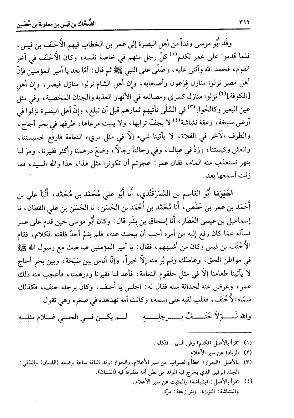 وفد أبو موسى وفدا من أهل البصرة إلى عمر بن الخطاب فيهم الأحنف بن قيس فلما قدموا على عمر تكلم (1) كل رجل منهم في خاصة نفسه وكان الأحنف في آخر القوم فحمد الله وأثنى عليه وصلى على النبي (صلى الله عليه وسلم) ثم قال أما بعد يا أمير المؤمنين فإن أهل مصر نزلوا منازل فرعون وأصحابه وإن أهل الشام نزلوا منازل قيصر وإن أهل الكوفة (2) نزلوا منازل كسرى ومصانعه في الأنهار العذبة والجنان المخصبة وفي مثل عين البعير وكالحوار (3) في السلى تأتيهم ثمارهم قبل أن تبلغ وإن أهل البصرة نزلوا في أرض سبخة زعقة نشاشة (4) لا يجف ترابها ولا ينبت مرعاها طرفها في بحر أجاج والطرف الآخر في الفلاة لا يأتينا شئ إلا في مثل مرئ النعامة فارفع خسيستنا وانعش وكيستنا وزد في عيالنا وفي رجالنا رجالا وضع درهمنا وأكثر فقيرنا ومر لنا بنهر نستعذب منه الماء فقال عمر عجزتم أن تكونوا مثل هذا هذا والله السيد فما زلت أسمعها بعد أخبرنا أبو القاسم بن السمرقندي أنا أبو علي محمد بن محمد أنبأ علي بن أحمد بن عمر بن حفص أنا محمد بن أحمد بن الحسن نا الحسن بن علي القطان نا إسماعيل بن عيسى العطار أنا إسحاق بن بشر قال وكان أبو موسى حين قدم على عمر فسأله عما كان رفع إليه من أمره أحب أن يبحث عنه فلم يقم أحد فلقنه الكلام فقام الأحنف بن قيس وكان من أشبههم فقال يا أمير المؤمنين صاحبك مع رسول الله (صلى الله عليه وسلم) في مواطن الحق وعاملك ولم ير منه إلا خيرا وإنا أناس بين سبخة وبين بحر أجاج لا يأتينا طعامنا إلا في مثل حلقوم النعامة فأعد لنا فقيرنا ودرهمنا فأعجب منه ذلك عمر وعرض عنه لحداثة سنة فقال له اجلس يا أحنف وكان برجله حنف فكذلك سماه الأحنف فغلب لقبه على اسمه وكانت أمه تهدهده في صغره وهي تقول: * والله لولا حنف برجله * لم يكن في الحي غلام مثله *