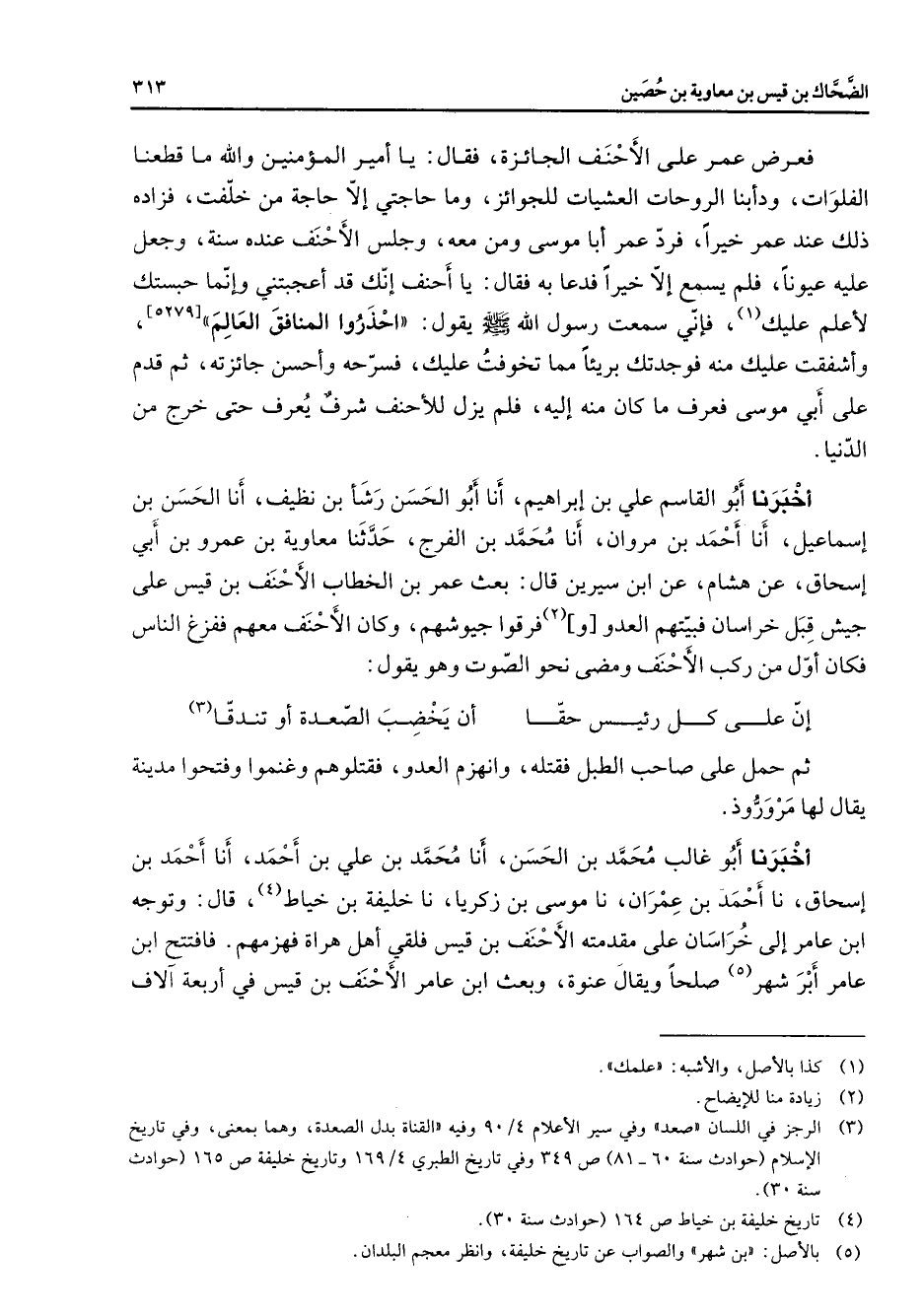فعرض عمر على الأحنف الجائزة فقال يا أمير المؤمنين والله ما قطعنا الفلوات ودأبنا الروحات العشيات للجوائز وما حاجتي إلا حاجة من خلفت فزاده ذلك عنه عمر خيرا فرد عمر أبا موسى ومن معه وجلس الأحنف عنده سنة وجعل عليه عيونا فلم يسمع إلا خيرا فدعا به فقال يا أحنف إنك قد أعجبتني وإنما حبستك لأعلم عليك (1) فإني سمعت رسول الله (صلى الله عليه وسلم) يقول احذروا المنافق العالم وأشفقت عليك منه فوجدتك بريئا مما تخوفت عليك فسرحه وأحسن جائزته ثم قدم على أبي موسى فعرف ما كان منه إليه فلم يزل للأحنف شرف يعرف حتى خرج من الدنيا أخبرنا أبو القاسم علي بن إبراهيم أنا أبو الحسن رشأ بن نظيف أنا الحسن بن إسماعيل أنا أحمد بن مروان أنا محمد بن الفرج حدثنا معاوية بن عمرو بن أبي إسحاق عن هشام عن ابن سيرين قال بعث عمر بن الخطاب الأحنف بن قيس على جيش قبل خراسان فبيتهم العدو و (2) فرقوا جيوشهم وكان الأحنف معهم ففزع الناس فكان أول من ركب الأحنف ومضى نحو الصوت وهو يقول: * إن على كل رئيس حقا * أن يخضب الصعدة أو تندقا (3) * ثم حمل على صاحب الطبل فقتله وانهزم العدو فقتلوهم وغنموا وفتحوا مدينة يقال لها مروروذ أخبرنا أبو غالب محمد بن الحسن أنا محمد بن علي بن أحمد أنا أحمد بن إسحاق نا أحمد بن عمران نا موسى بن زكريا نا خليفة بن خياط (4) قال وتوجه ابن عامر إلى خراسان على مقدمته الأحنف بن قيس فلقي أهل هراة فهزمهم فافتتح ابن عامر أبر شهر (5) صلحا ويقال عنوة وبعث ابن عامر الأحنف بن قيس في أربعة آلاف
