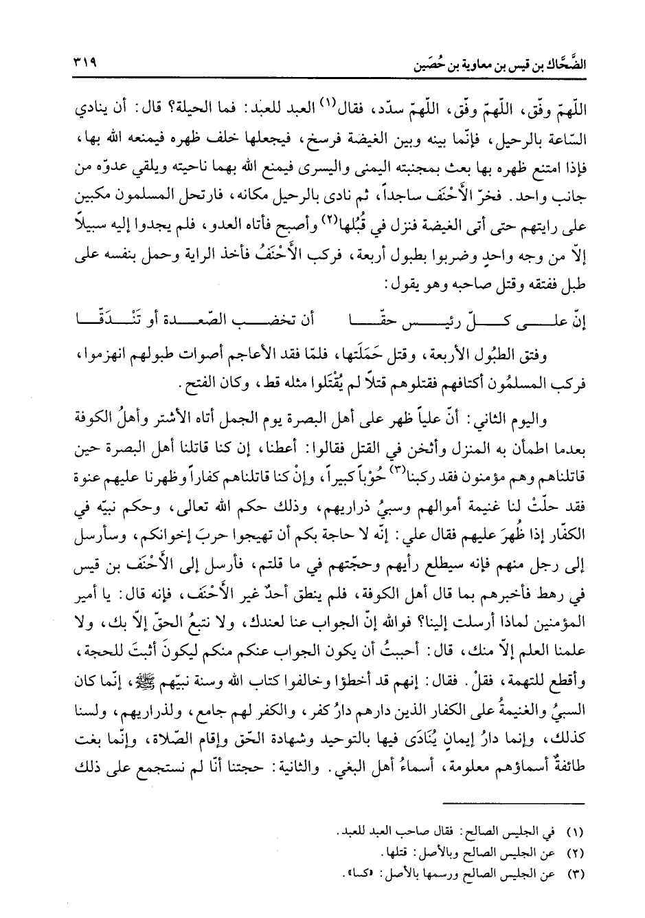 طبل ففتقه وقتل صاحبه وهو يقول: * إن على كل رئيس حقا * أن تخضب الصعدة أو تندقا * وفتق الطبول الأربعة وقتل حملتها فلما فقد الأعاجم أصوات طبولهم انهزموا فركب المسلمون أكتافهم فقتلوهم قتلا لم يقتلوا مثله قط وكان الفتح واليوم الثاني أن عليا ظهر على أهل البصرة يوم الجمل أتاه الأشتر وأهل الكوفة بعدما اطمأن به المنزل وأثخن في القتل فقالوا أعطنا إن كنا قاتلنا أهل البصرة حين قاتلناهم وهم مؤمنون فقد ركبنا (3) حوبا كبيرا وإن كنا قاتلناهم كفارا وظهرنا عليهم عتوة فقد حلت لنا غنيمة أموالهم وسبي ذراريهم وذلك حكم الله تعالى وحكم نبيه في الكفار إذا ظهر عليهم فقال علي إنه لا حاجة بكم أن تهيجوا حرب إخوانكم وسأرسل إلى رجل منهم فإنه سيطلع رأيهم وحجتهم في ما قلتم فأرسل إلى الأحنف بن قيس في رهط فأخبرهم بما قال أهل الكوفة فلم ينطق أحد غير الأحنف فإنه قال يا أمير المؤمنين لما أرسلت إلينا فوالله إن الجواب عنا لعندك ولا نتبع الحق إلا بك ولا علمنا العلم إلا منك قال أحببت أن يكون الجواب عنكم منكم ليكون أثبت للحجة وأقطع للتهمة فقل فقال إنهم قد أخطؤا وخالفوا كتاب الله وسنة نبيهم (صلى الله عليه وسلم) إنما كان السبي والغنيمة على الكفار الذين دارهم دار كفر والكفر لهم جامع ولذراريهم ولسنا كذلك وإنما دار إيمان ينادى فيها بالتوحيد وشهادة الحق وإقام الصلاة وإنما بغت طائفة أسماؤهم معلومة أسماء أهل البغي والثانية حجتنا أنا لم نستجمع على ذلك