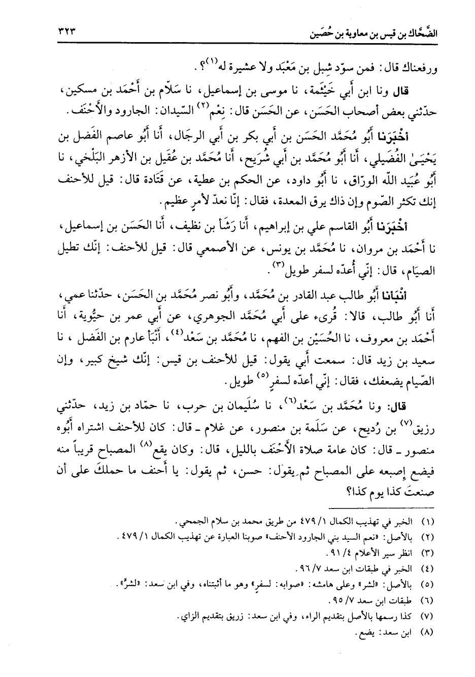 أنبأنا أبو طالب عبد القادر بن محمد وأبو نصر محمد بن الحسن حدثنا عمي أنا أبو طالب قالا قرئ على أبي محمد الجوهري عن أبي عمر بن حيوية أنا أحمد بن معروف نا الحسين بن الفهم نا محمد بن سعد (4) أنبأ عارم بن الفضل نا سعيد بن زيد قال سمعت أبي يقول قيل للأحنف بن قيس إنك شيخ كبير وإن الصيام يضعفك فقال إني أعده لسفر (5) طويل قال ونا محمد بن سعد (6) نا سليمان بن حرب نا حماد بن زيد حدثني رزيق (7) بن رديح عن سلمة بن منصور عن غلام قال كان للأحنف اشتراه أبوه منصور قال كان عامة صلاة الأحنف بالليل قال وكان يقع (8) المصباح قريبا منه فيضع إصبعه على المصباح ثم يقول حسن ثم يقول يا أحنف ما حملك على أن صنعت كذا يوم كذا