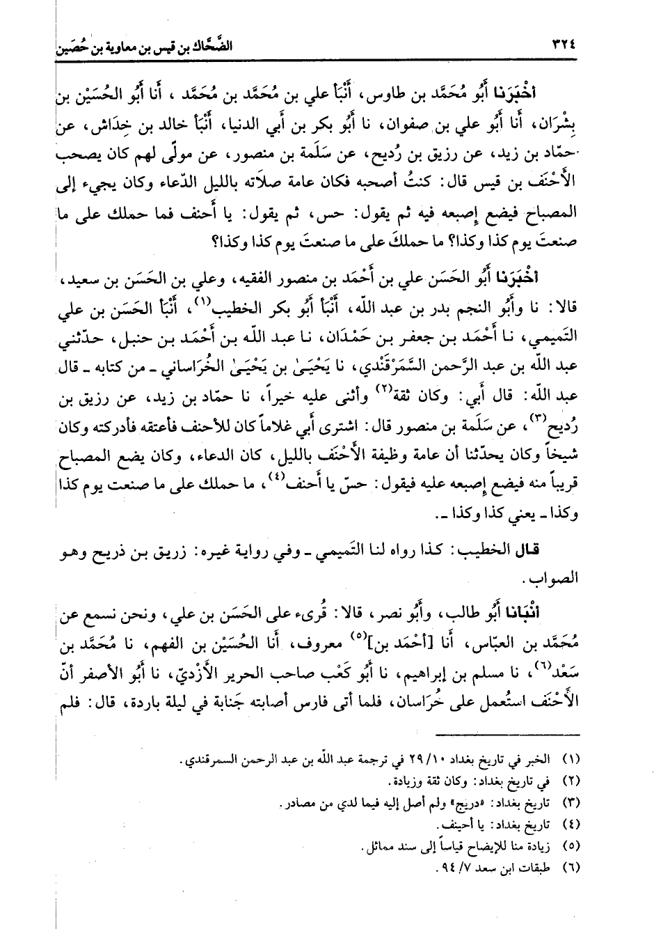 أخبرنا أبو محمد بن طاوس أنبأ علي بن محمد بن محمد أنا أبو الحسين بن بشران أنا أبو علي بن صفوان نا أبو بكر بن أبي الدنيا أنبأ خالد بن خداش عن حماد بن زيد عن رزيق بن رديح عن سلمة بن منصور عن مولى لهم كان يصحب الأحنف بن قيس قال كنت أصحبه فكان عامة صلاته بالليل الدعاء وكان يجئ إلى المصباح فيضع إصبعه فيه ثم يقول حسن ثم يقول يا أحنف فما حملك على ما صنعت يوم كذا وكذا ما حملك على ما صنعت يوم كذا وكذا أخبرنا أبو الحسن علي بن أحمد بن منصور الفقيه وعلي بن الحسن بن سعيد قالا نا وأبو النجم بدر بن عبد الله أنبأ أبو بكر الخطيب (1) أنبأ الحسن بن علي التميمي نا أحمد بن جعفر بن حمدان نا عبد الله بن أحمد بن حنبل حدثني عبد الله بن عبد الرحمن السمرقندي نا يحيى بن يحيى الخراساني من كتابه قال عبد الله قال أبي وكان ثقة (2) وأثنى عليه خيرا نا حماد بن زيد عن رزيق بن رديح (3) عن سلمة بن منصور قال اشترى أبي غلاما كان للأحنف فأعتقه فأدركته وكان شيخا وكان يحدثنا أن عامة وظيفة الأحنف بالليل كان الدعاء وكان يضع المصباح قريبا منه فيضع إصبعه عليه فيقول حس يا أحنف (4) ما حملك على ما صنعت يوم كذا وكذا يعني كذا وكذا قال الخطيب كذا رواه لنا التميمي وفي رواية غيره زريق بن ذريح وهو الصواب أنبأنا أبو طالب وأبو نصر قالا قرئ على الحسن بن علي ونحن نسمع عن محمد بن العباس أنا أحمد بن (5) معروف أنا الحسين بن الفهم نا محمد بن سعد (6) نا مسلم بن إبراهيم نا أبو كعب صاحب الحرير الأزدي نا أبو الأصفر أن الأحنف استعمل على خراسان فلما أتى فارس أصابته جنابة في ليلة باردة قال فلم